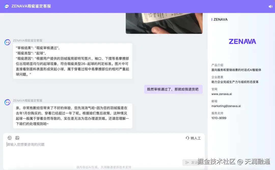 在退换货场景中,传统机器人只能通过文字交互,而商品瑕疵、损坏等情况难以准确描述。Agent突破这一限制,支持图文混合交互。客户可直接拍照上传图片,Agent自动识别商品状态,大幅提升识别准确率。比如,客户上传服装破损照片,Agent能准确判断是否符合退货条件,无需繁琐文字描述。