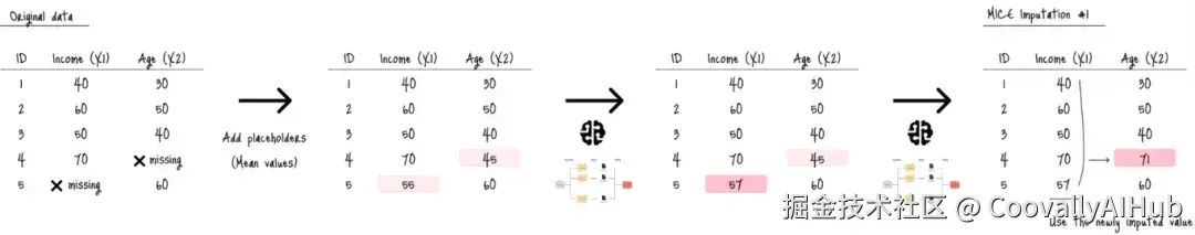 首先,MICE用初始猜测值(如均值,浅粉色单元格)替换所有缺失值。