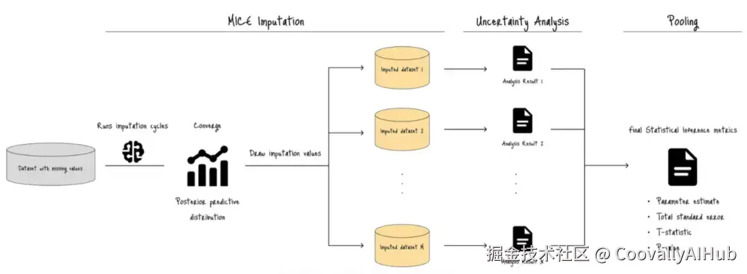 多元链式方程插补(MICE)是一个强大的框架,用于填补缺失值,同时最大限度地减少插补过程中的偏差和不确定性。