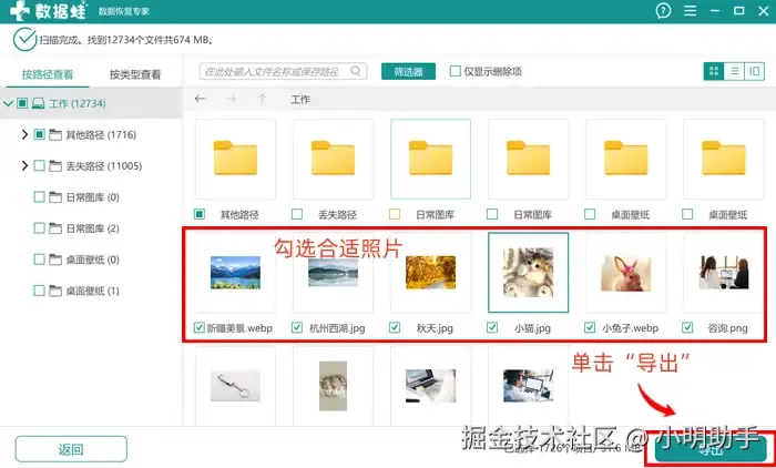 第二步: 左上角显示“扫描完成”后,该软件能够显示可恢复图片的预览图,点击文件还可以查看大图,确认好为需要恢复的照片后再选中,单击“导出”的按钮;