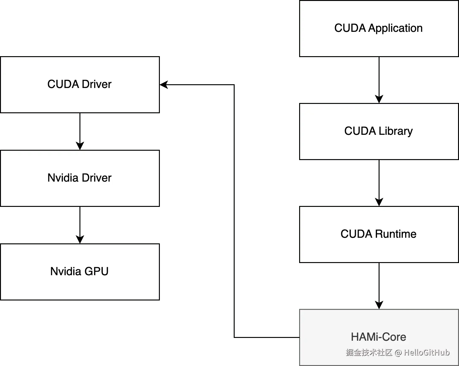 HAMi-core 本质上是一个实现了 CUDA API Hook(钩子)的动态链接库 (libvgpu.so)。它的工作原理非常巧妙,也十分经典: