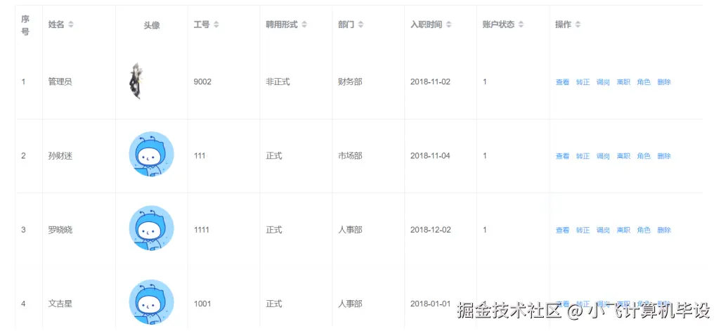 - 左侧为功能菜单,右侧为员工表格,支持 “按部门 / 岗位筛选”“搜索员工姓名”;