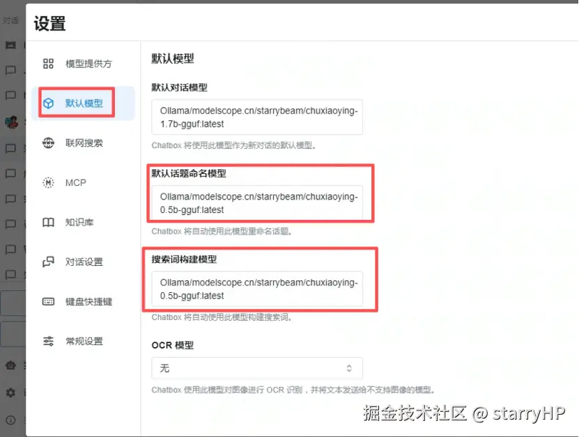 然后在“默认模型”中,修改“默认话题命名模型”和“搜索词构建模型”为刚添加的轻量模型