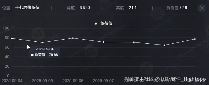 此外,测点位置具备点击交互功能,点击目标测点即可调取其近期历史数据,且数据将以折线图的可视化形式呈现,清晰展示数据变化轨迹,助力高效分析。