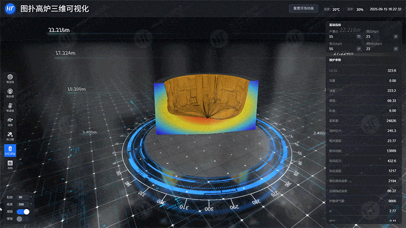 图扑 HT 通过采集炉内温度数据,结合数据同化算法与三维温度场重建技术,实现对高炉软熔带等温平台的精准可视化定位,为判断软熔带形态、优化冶炼参数提供关键支撑。
