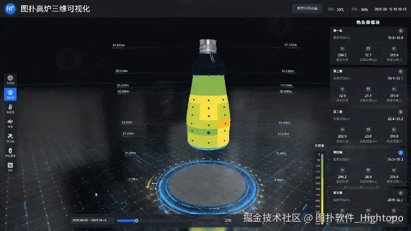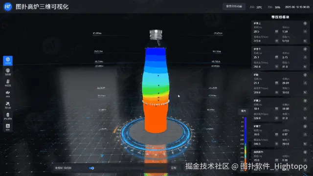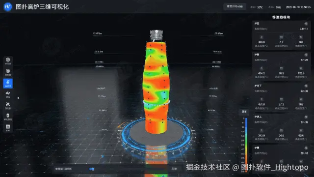 为实现炉内温度分布的全域感知,图扑以高炉实体尺寸为基准,1:1 还原搭建高炉三维模型,再将离散的测温数据通过插值算法进行空间插补,确保温度场呈现的连续性与完整性。并采用图扑软件自研的专属热力渲染引擎,将温度值映射为多色阶渐变热力图。场景内支持对三维模型的任意角度旋转查看,可从不同视角掌握炉内温度分布细节。