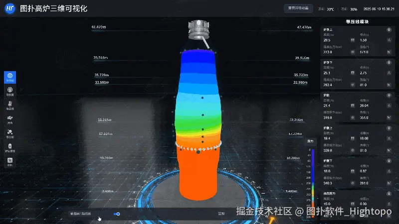 图扑软件依托自研 2D/3D 可视化渲染与轻量化交互技术,搭建高精度高炉三维模型,动态呈现炉体结构、风口分布、料面运动等关键要素,同时深度集成等压线、热负荷、等温线等多维仿真模块,将 CAE 仿真计算得出的高炉核心数据及复杂内部物理场数据,转化为直观可视的场景化内容,为破解“黑箱”难题提供技术支撑。
