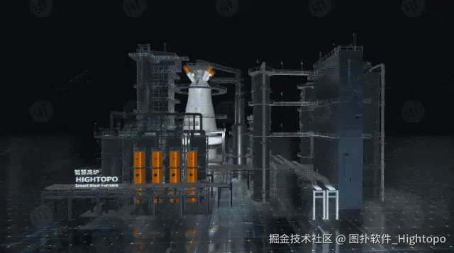图扑凭借轻量化三维建模技术,根据钢厂现场的 CAD 图、鸟瞰图、设备三视图等资料,对炉壁、热风炉、供料及输送设备等厂区设备进行外观建模,其外观纹理细节与结构特征均高度还原实体设备,营造出工业场景的沉浸式视觉体验。