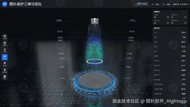 图扑 HT 三维场景内支持操作人员实时观察原料从布料器精准抛洒至高炉内部的动态过程,通过 HT 3D 技术清晰追踪矿石、焦炭等不同原料的落点位置与料层堆积形态,确保原料分布状态可实时监控。