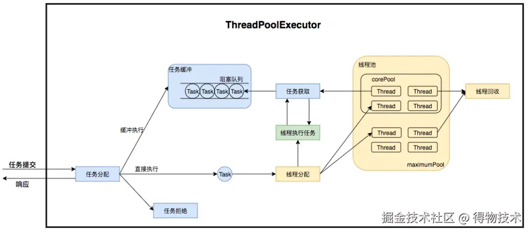 这个图能很好的表明运行原理,但是忽略了很多细节,比如所谓的缓冲执行是在什么条件下去走的呢?直接执行又是什么逻辑下执行呢?最后的任务拒绝又是怎么回事?带着这些疑问点,我们直接来进行一个源码级别的分析:
