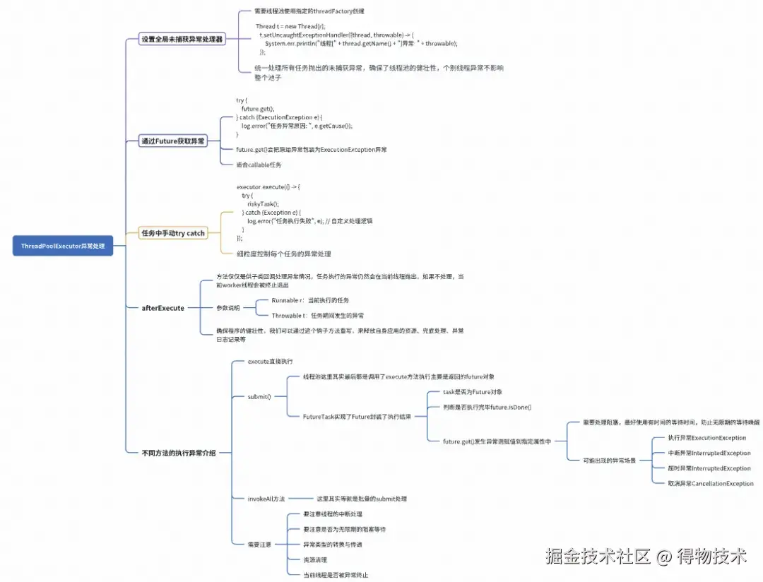 - 异常处理:通过afterExecute来对发生的异常进行兜底处理,任务细粒度的try catch或UncaughtExceptionH捕获异常处理防止线程崩溃退出;