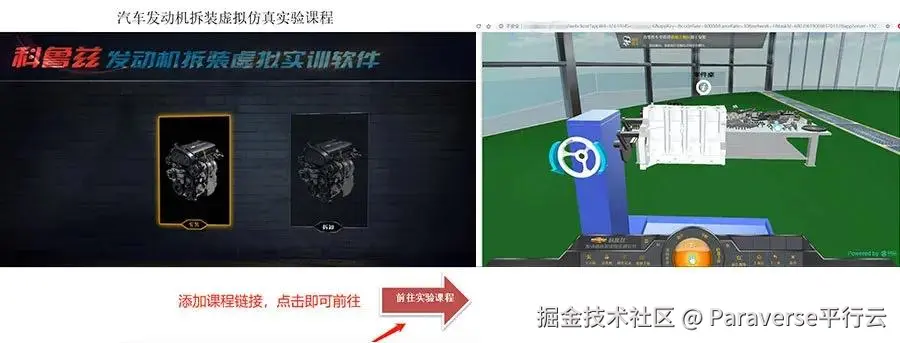 以QQ群直播为例进行介绍(其他直播平台同理,正常直播教学过程,点击教案中的课程按钮即可打开虚仿实验课程):多门仿真实验课程上传完毕后,在教案PPT中添加课程URL 链接,如汽车发动机拆装: