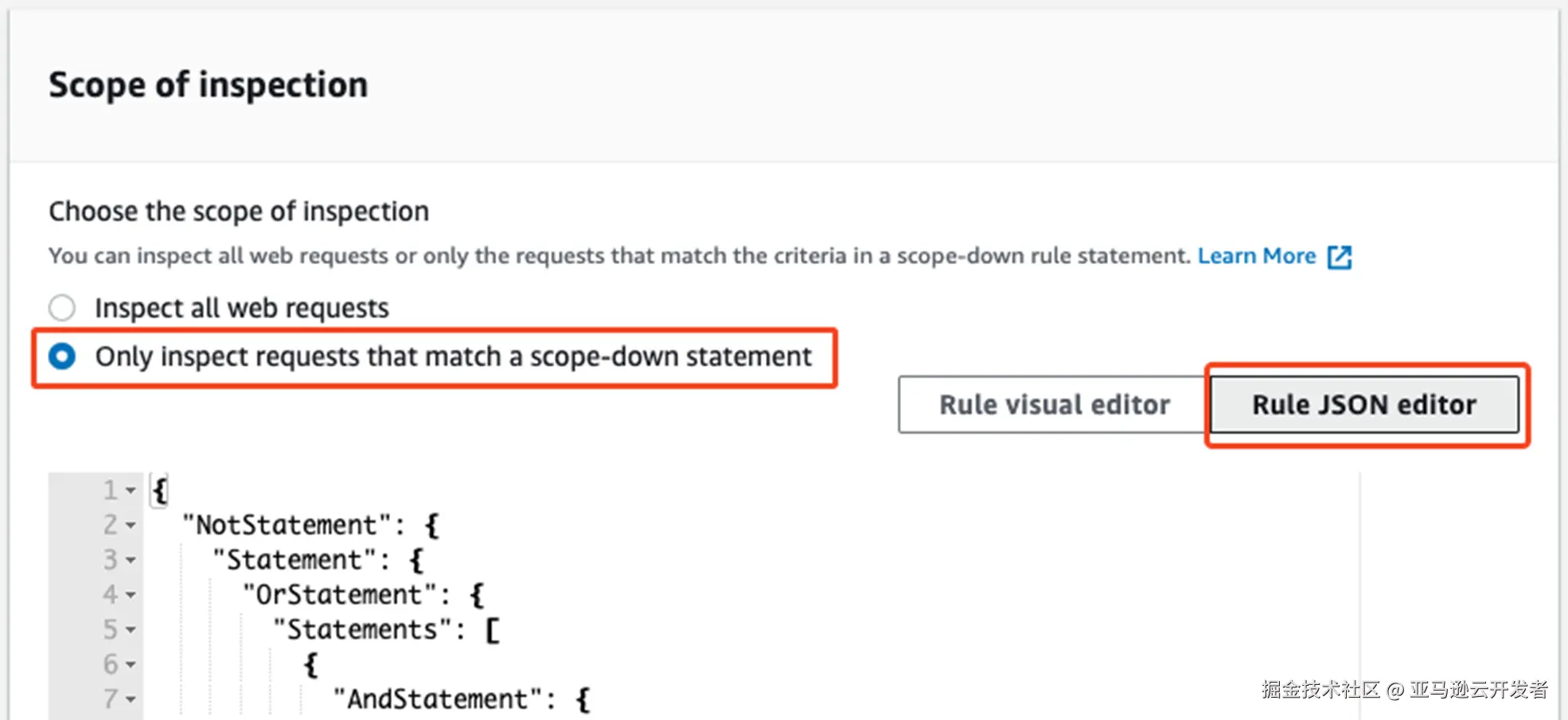 - 在 Scope of inspection 部分选择 Only inspect requests that match a scope-down statement