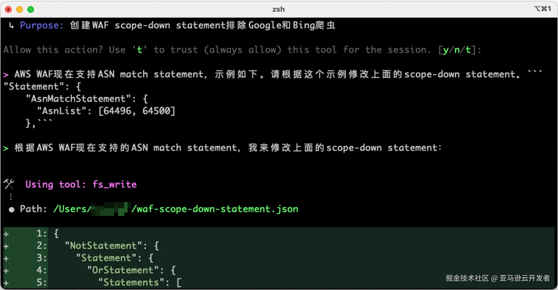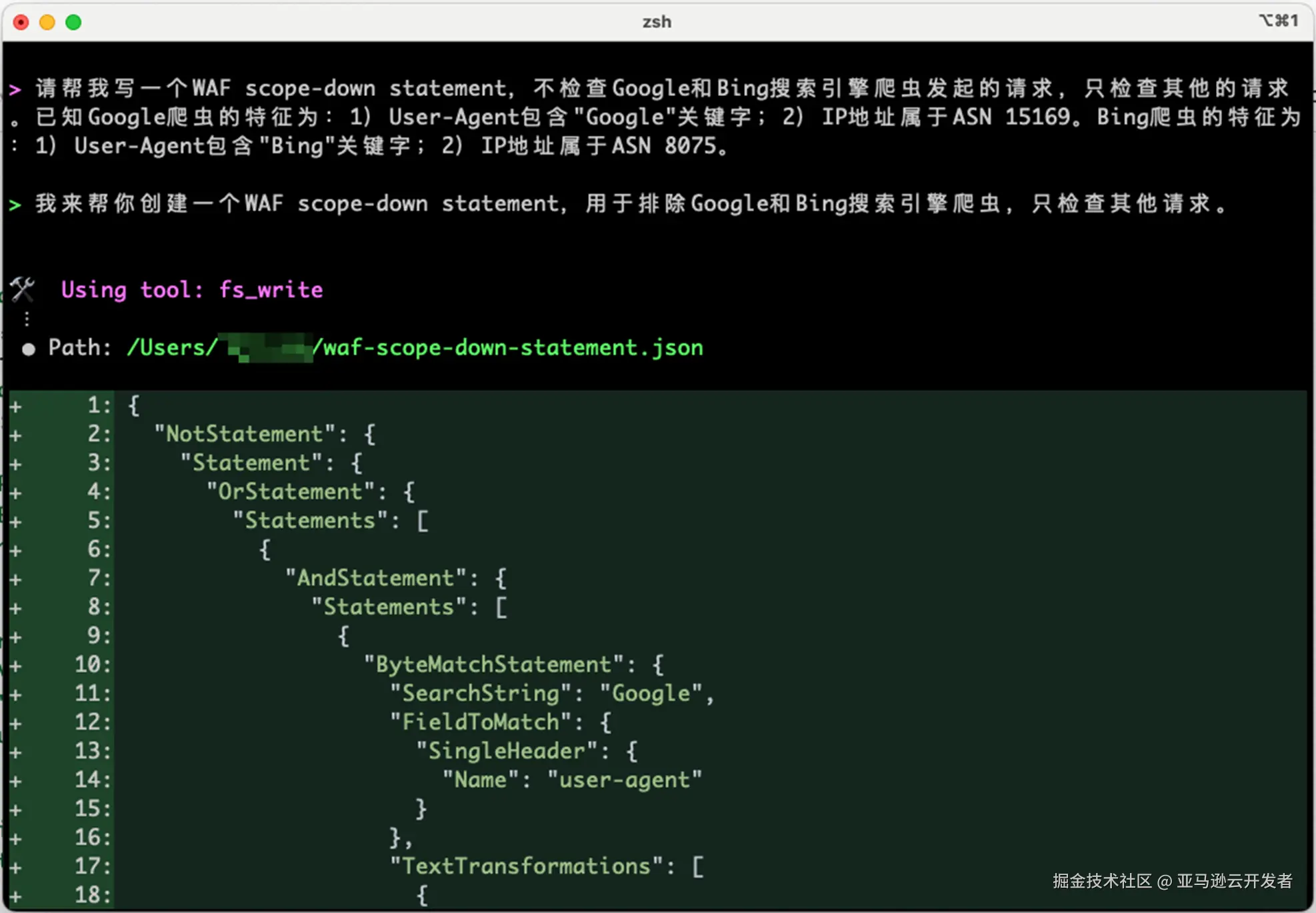 这种识别逻辑涉及复杂的多层嵌套条件判断,手工编写 JSON 规则既耗时又容易出错。使用 Amazon Q Developer CLI 可以大大简化这个过程。Amazon Q Developer CLI 是 Amazon Q 的命令行工具,Amazon Q 是一个由生成式 AI 驱动的助手。您可以使用它来询问有关 AWS 架构、资源和一般开发任务的问题。我们向 Q CLI 描述需求,让它生成相应的 WAF scope-down statement。