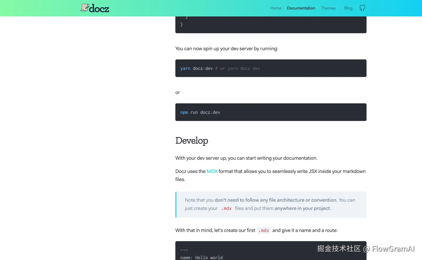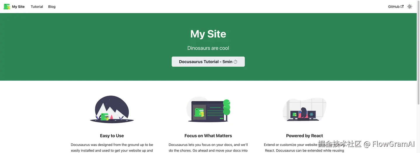 Docusaurus 类似 Gatsby,也支持 cli 一键安装生成: npm init docusaurus@latest my-website classic 配置好后直接有官网首页、有 doc tutorial 页面,也兼备样式