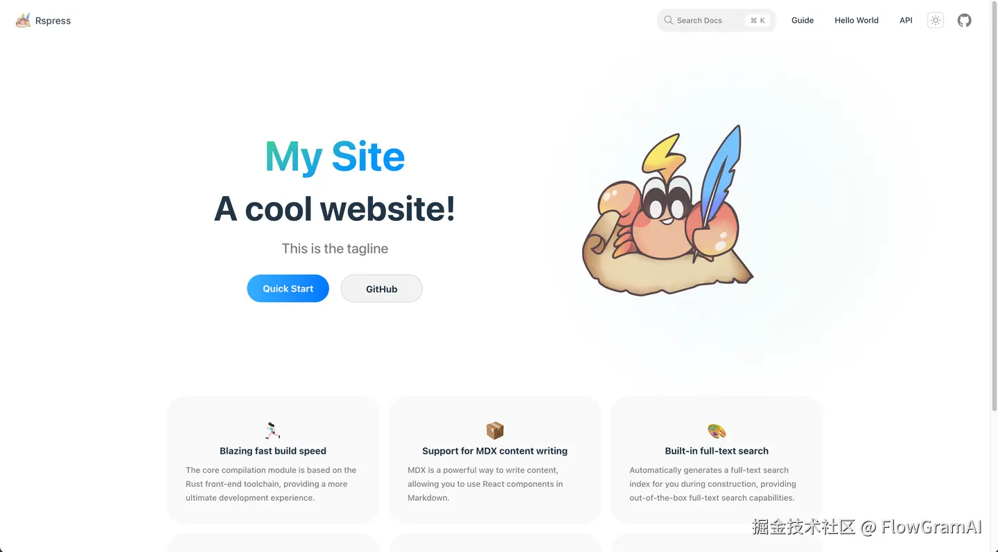 只支持 markdown 和组件的绑定,不支持实时热更新。 但是支持配置 mdxRs 。其能力底层基于 Rspress 自研的 @rspress/mdx-rs 库来实现,性能比 JS 版本的 MDX 编译器提升 10 倍以上,但不支持 JS 的插件。 Rspress 也是一键生成:npm create rspress@latest 跑起来后,ui 比较简单: