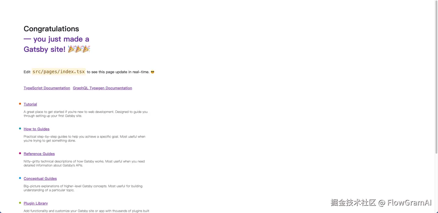 Gatsby 刚配置好,站点内容是这样的: header、doc 悬浮窗等功能都需要额外的插件配置,具有一定的上手成本。