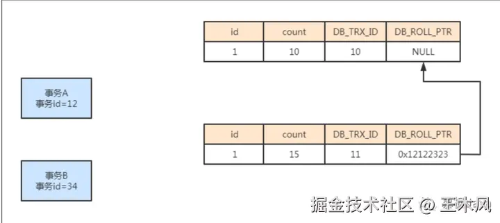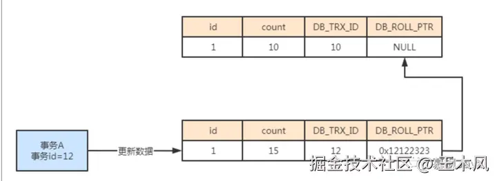 每个事务都有自己的一个id,就像其身份证一样唯一标记该事务。当事务启动的时候,向Innodb存储引擎进行申请。假设此时如果打南边来了个事务A,它的事务id为12,事务A对表中的数据字段count进行修改,修改后该条数据对应的事务id为12,同时回滚指针指向实际的undo log回滚日志的地址。