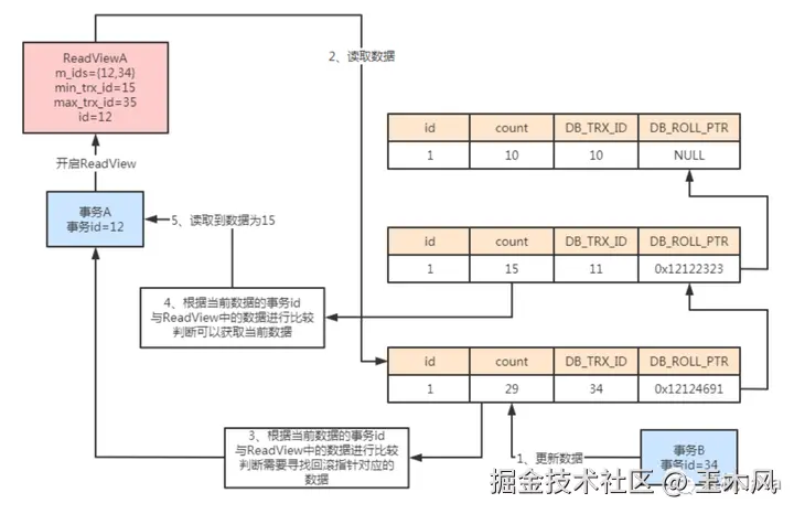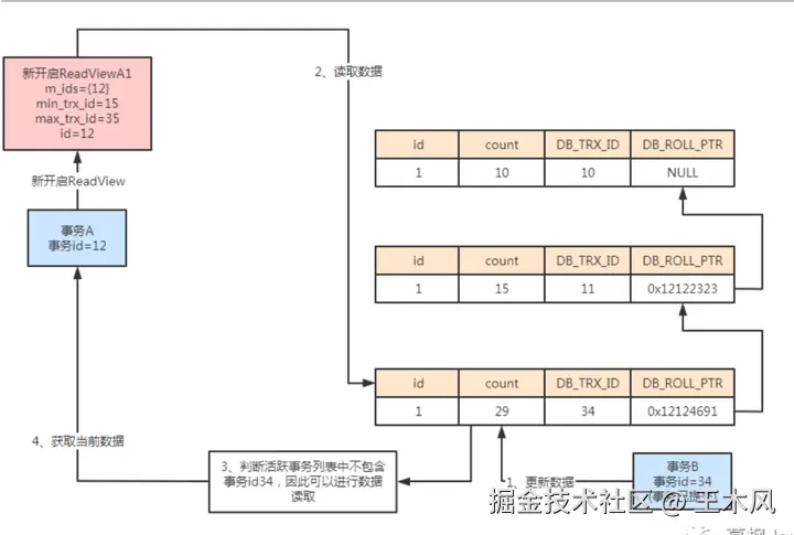 如果此时事务B进行了数据修改,修改count为29。而事务A再次进行数据读取时,继续进行判断,发现当前数据对应的事务id为34比当前的查询事务要大,同时在m_ids中。说明该事务id对应的事务和事务A属于并发执行事务,因此不能进行数据读取。则根据undo log版本链,往上寻找undo log信息。如果找到的事务id小于当前读取数据的id则证明此时的数据是在当前开启查询事务之前提交的,因此可以进行数据的查询。