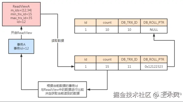 当事务A需要读取数据时,开启ReadView。由于此时数据库活跃的事务为事务A以及事务B,那么对应的ReadView中m_ids={12,34},min_trx_id=12,max_trx_id=35,当前需要执行的事务id为12。此时事务A读取数据时,先判断当前的事务id为12,而数据中的事务id为11,小于当前事务A的id。说明当前读取的数据是在事务A开启之前提交的,因此可以正常进行数据读取。
