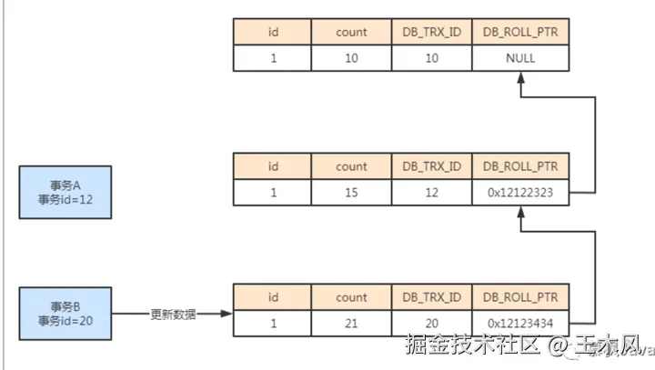 此时打北边又来了个事务B,它的事务id为20,事务B将表中的数据字段count修改为21,对应数据的事务id变为20,回滚指针指向上一条undo log信息。如下图所示:
