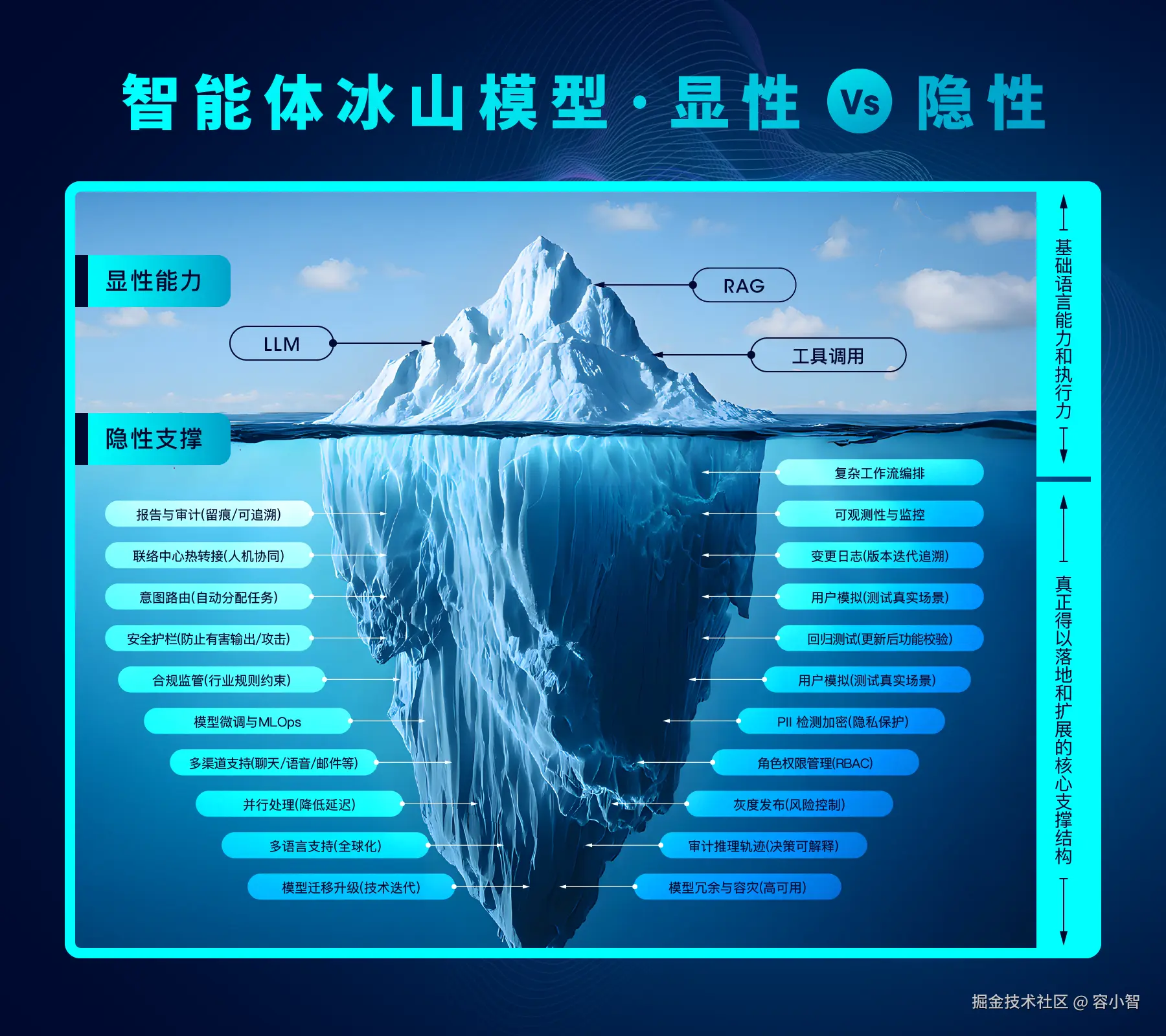 其实,AI Agent从来不是“模型 + 插件”的简单拼接,而是一套复杂的系统工程。就像一座漂浮的冰山,我们能看到的“对话交互、工具调用”等显性能力,只是露出水面的10%;真正决定它能否在企业里用起来、用得稳的,是水下90%的隐性工程——那些支撑智能体合规运行、安全调用数据、稳定部署、精准测试的庞大体系。没有这套 “水下支撑”,再强的大模型也只是 “困在瓶子里的巨人”,空有智慧却无法真正创造价值。