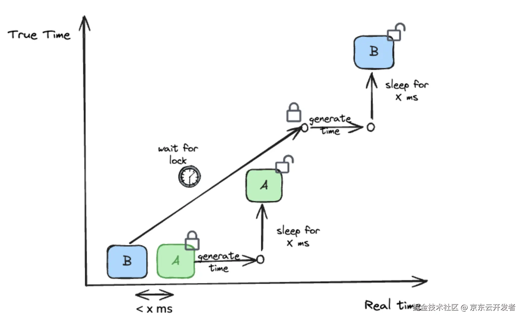 上图显示了进程 A 和 B 生成的时间如何单调增加,即使进程 B 在开始时的本地时钟比 A 低,但通过等待 x ms 的不确定性窗口过去。