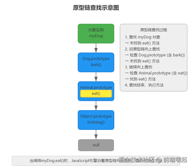 在这个例子中,myDog对象的原型链是:myDog -> Dog.prototype -> Animal.prototype -> Object.prototype -> null。当我们调用myDog.eat()时,JavaScript首先检查myDog对象本身是否有eat方法,没有找到就沿着原型链向上查找,最终在Animal.prototype上找到了这个方法。