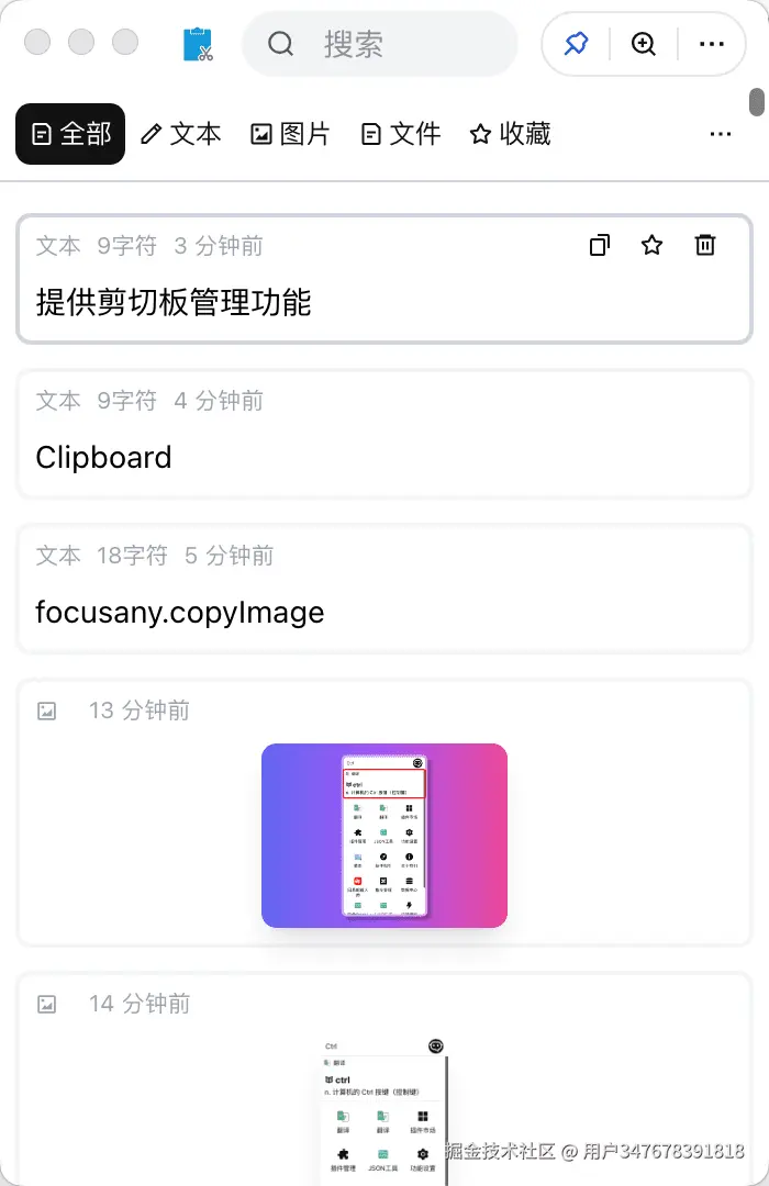FocusAny 内置的剪切板管理底层会自动记录剪切板历史记录,通过安装剪切板管理插件,可以实现剪切板的历史管理、搜索、收藏。