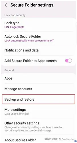 步骤4.打开安全文件夹,转到“设置”,然后选择“备份和还原”。从三星云还原安全文件夹数据。