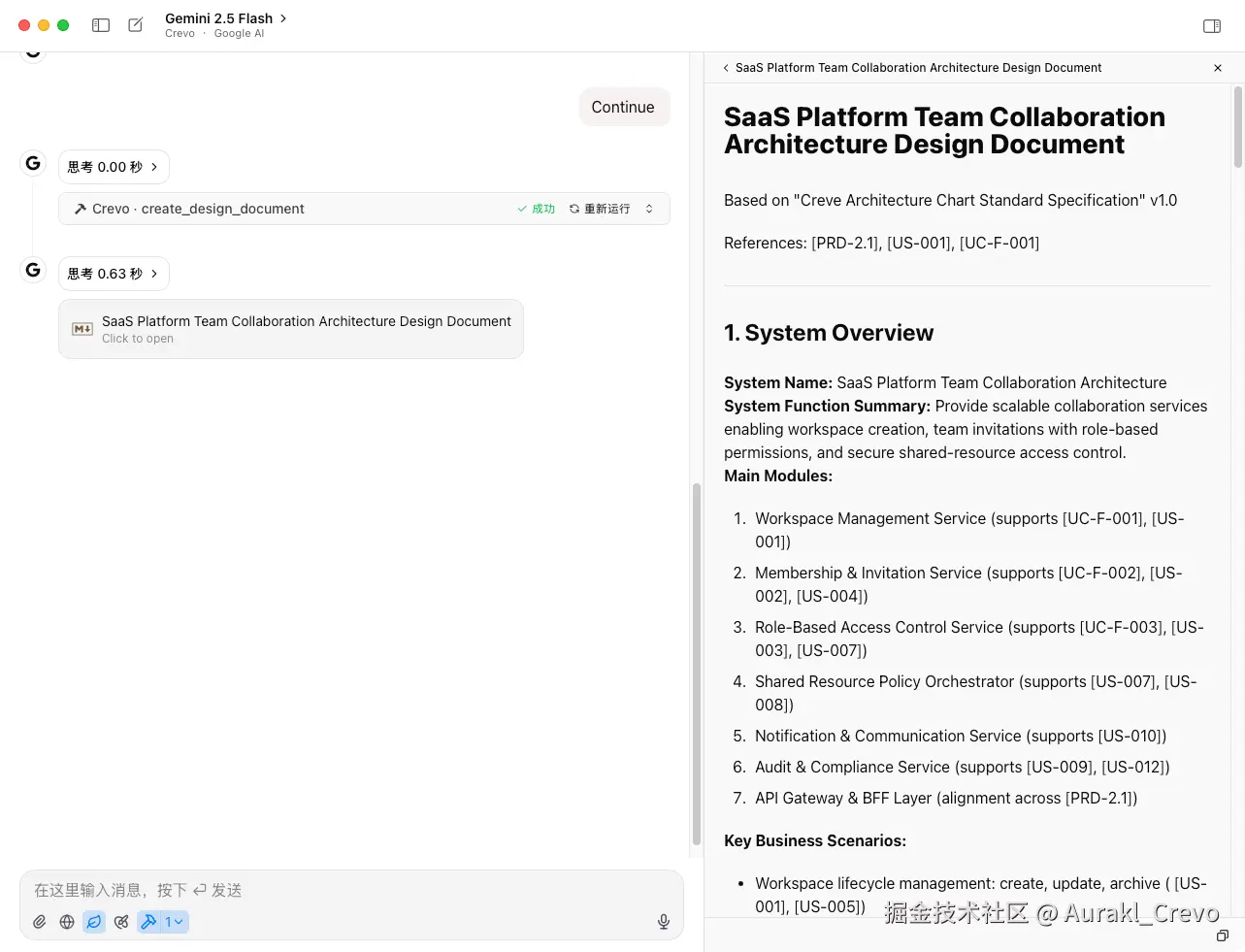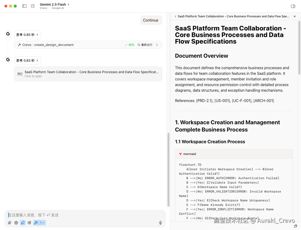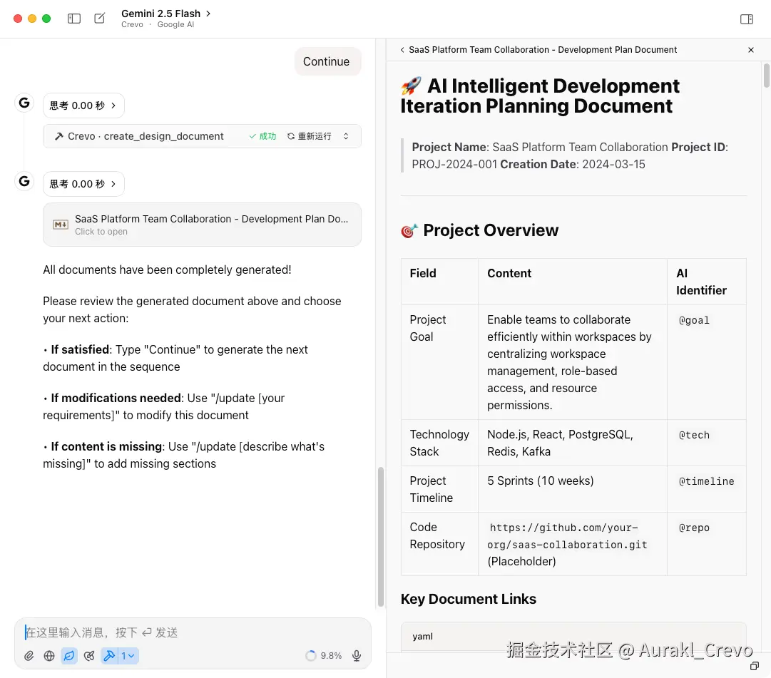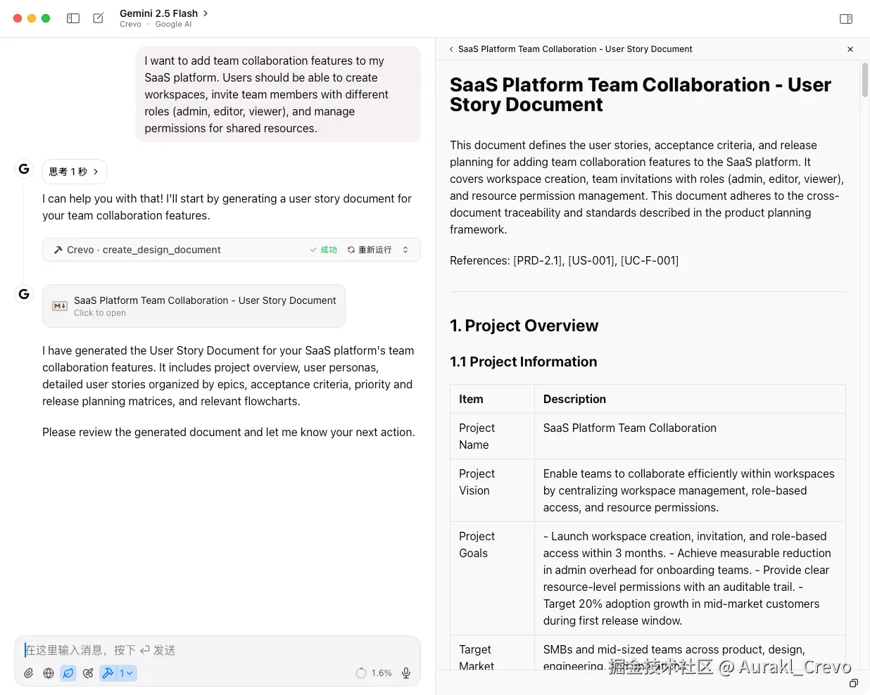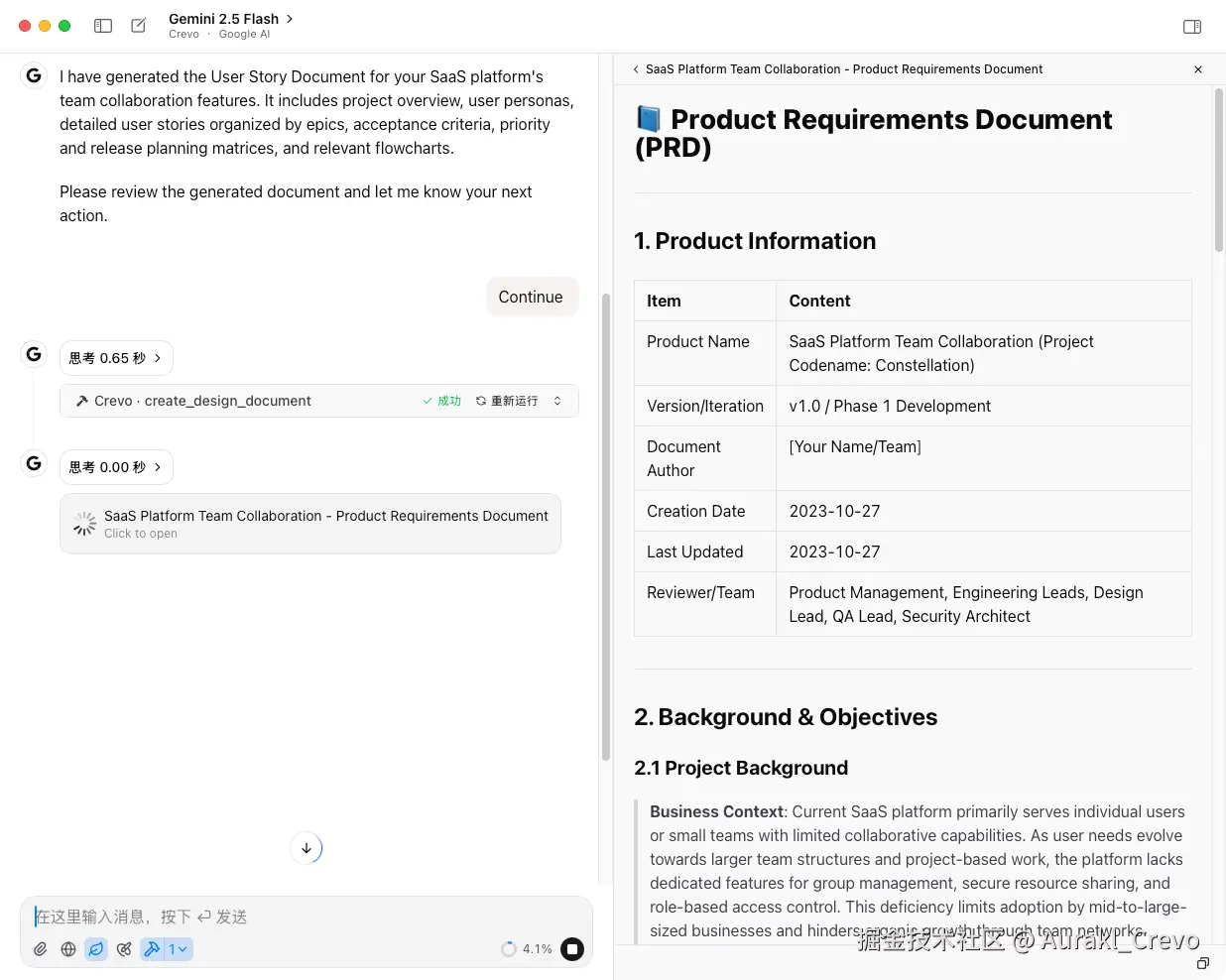 继续对话,Crevo 自动进入下一步,生成了完整的 PRD 文档: