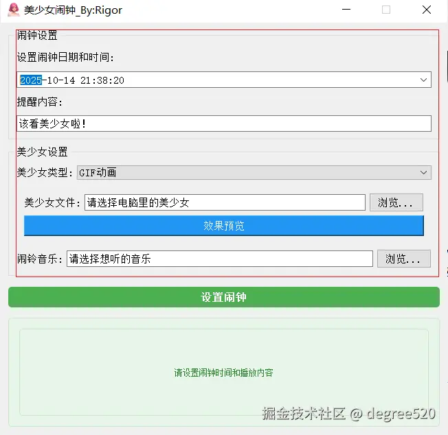 打开软件,设置闹钟日期和时间,提醒内容按需填写;类型选择“动画”,也支持视频文件。随后挑选对应动画与提示音乐,点击“设置闹钟”完成创建。到达设定时间后,窗口自动弹出并播放所选动画与音乐,可暂停或关闭,整体操作直观,适合日常备忘与定时提醒,有需要的朋友可以下载使用啦!
