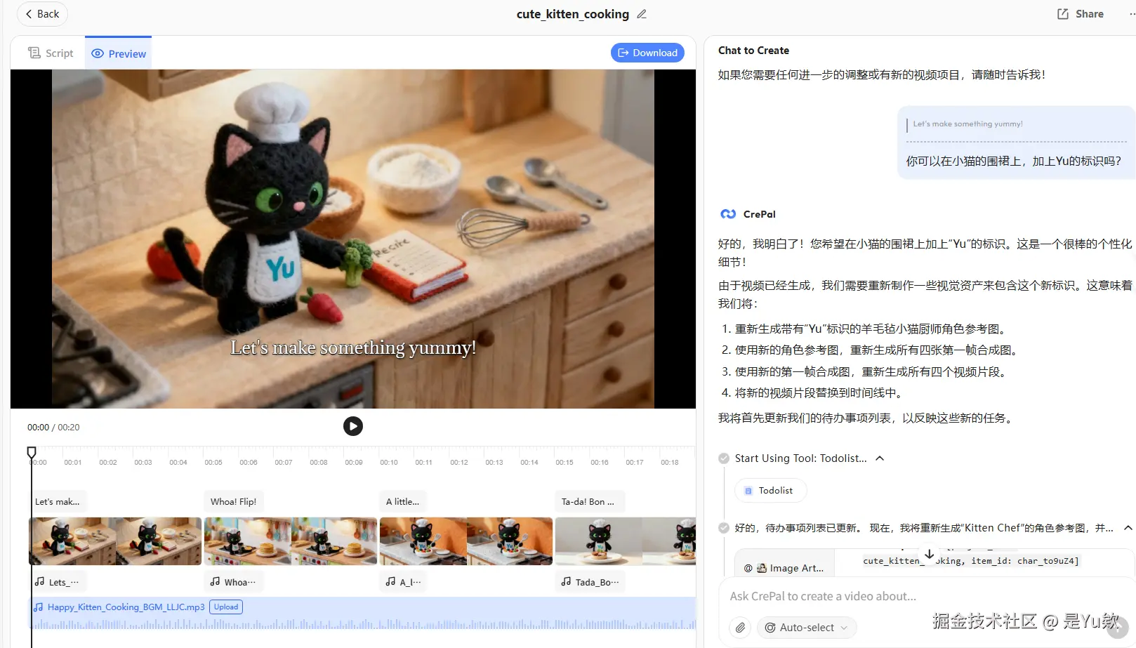在Agent生成了视频片段后,我希望其中一幕猫咪的围裙可以更个性化一点。按照传统流程,我可能得重新作图了。但在CrePal里,我直接在对话框里输入: “你可以在小猫的围裙上,加上Yu的标识吗?”