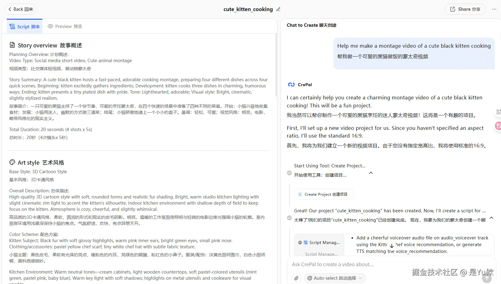 为了验证它的能力,我给了一个简短的指令: Help me make a montage video of a cute black kitten cooking