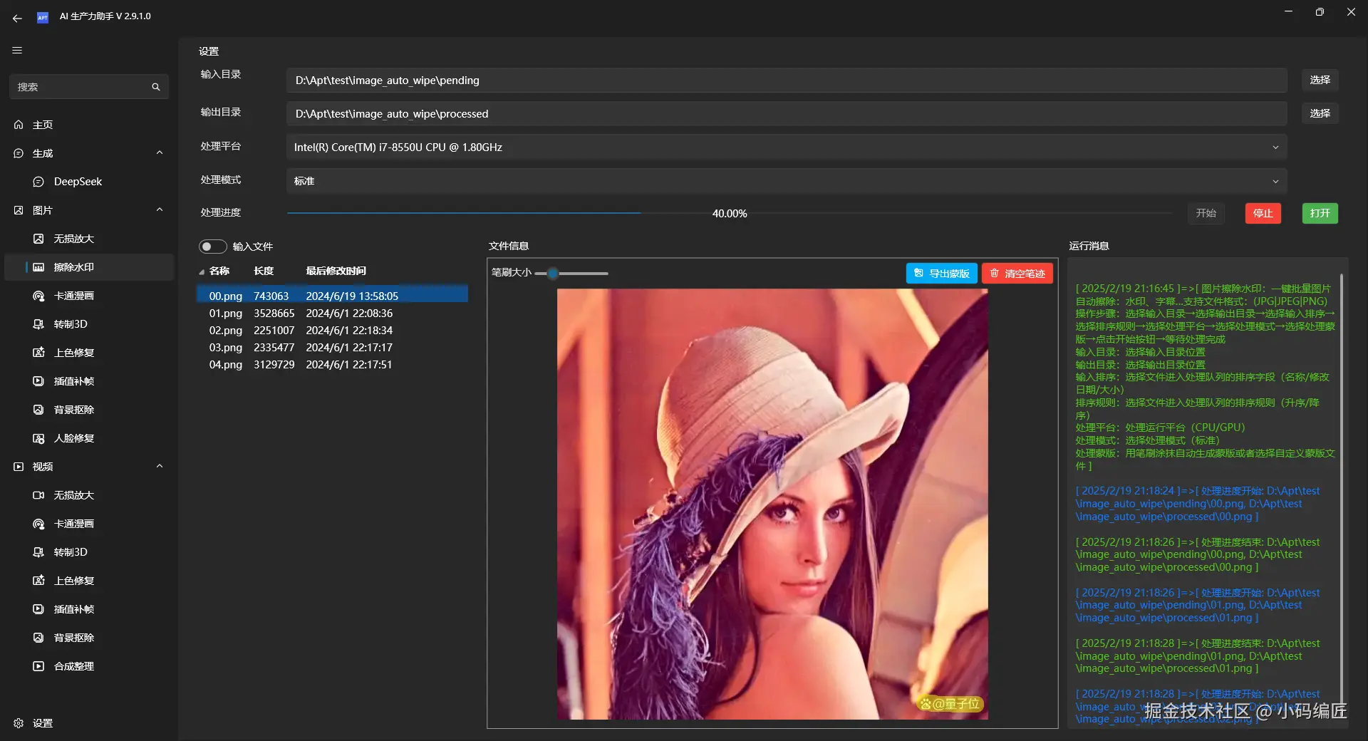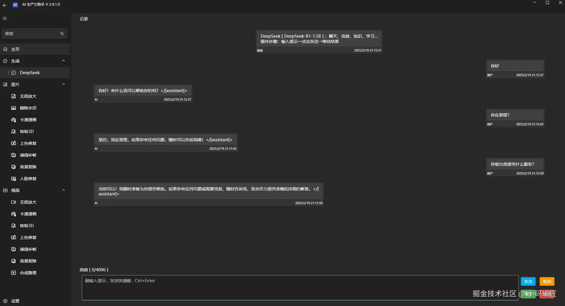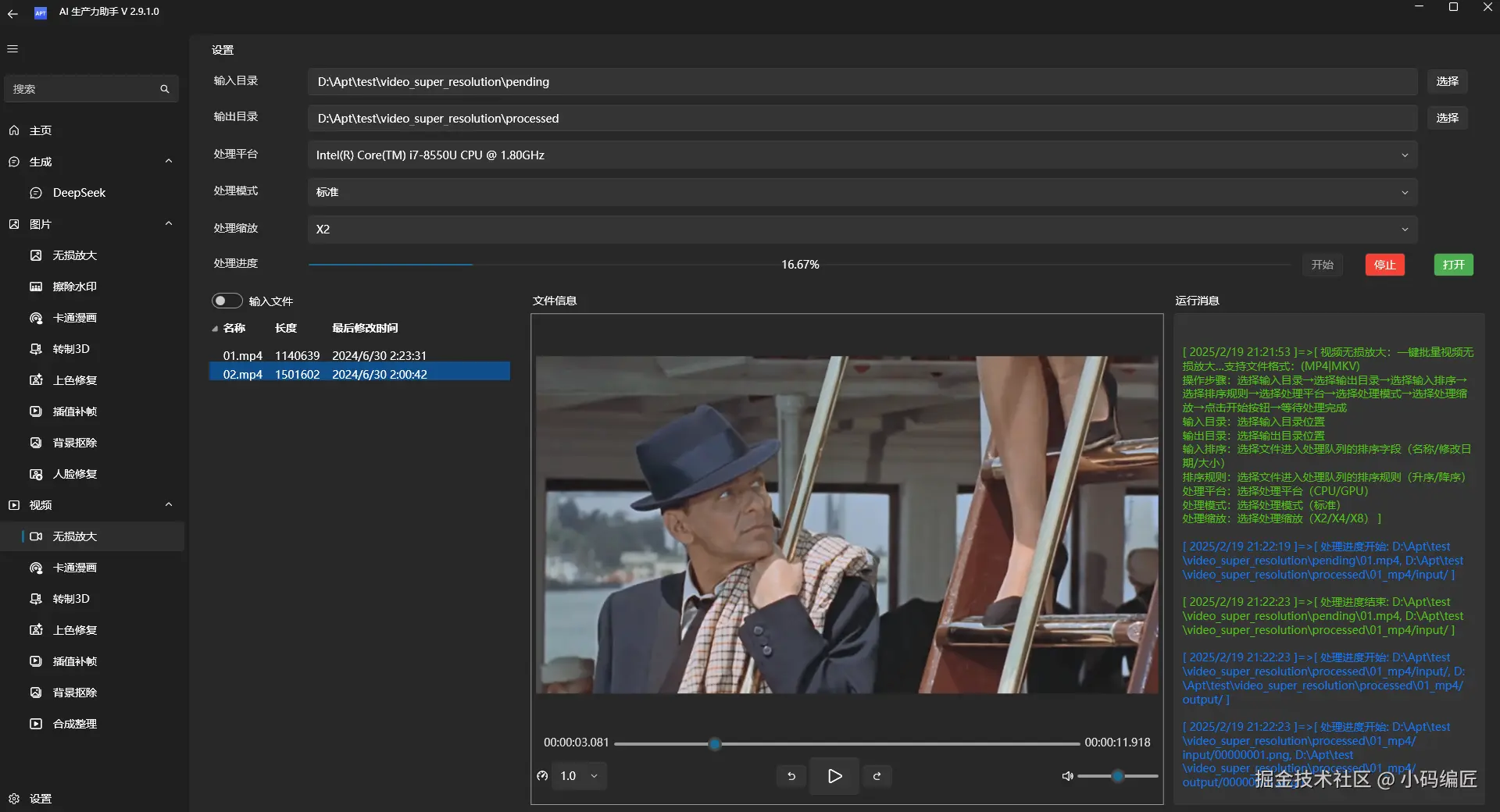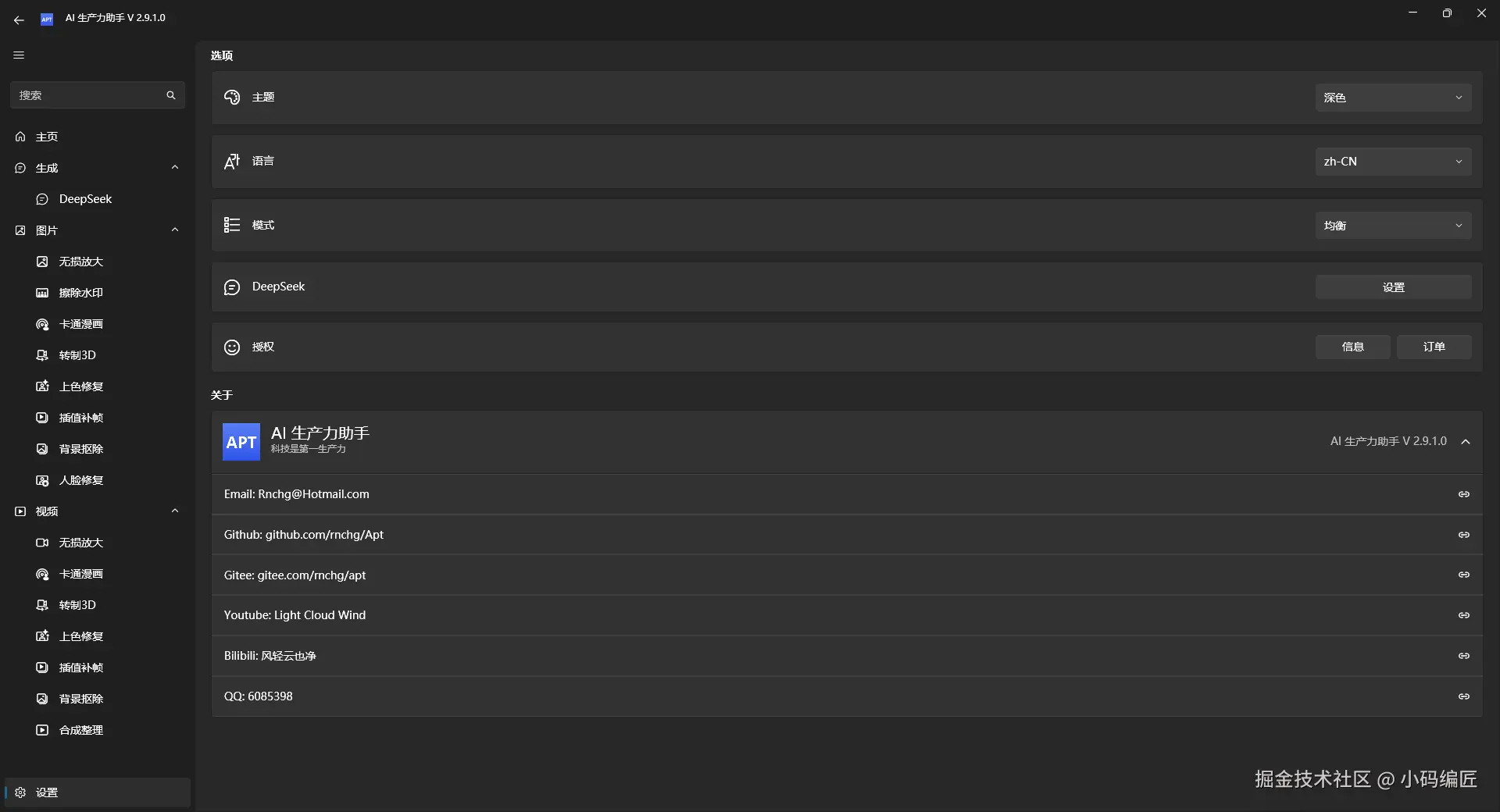 实际使用中,APT 表现出色。图像放大清晰自然,水印去除准确无痕;视频补帧流畅,风格迁移效果生动;语音分离干净利落,降噪效果显著。本地对话模型响应迅速,语义理解能力强,能有效辅助写作与思考。