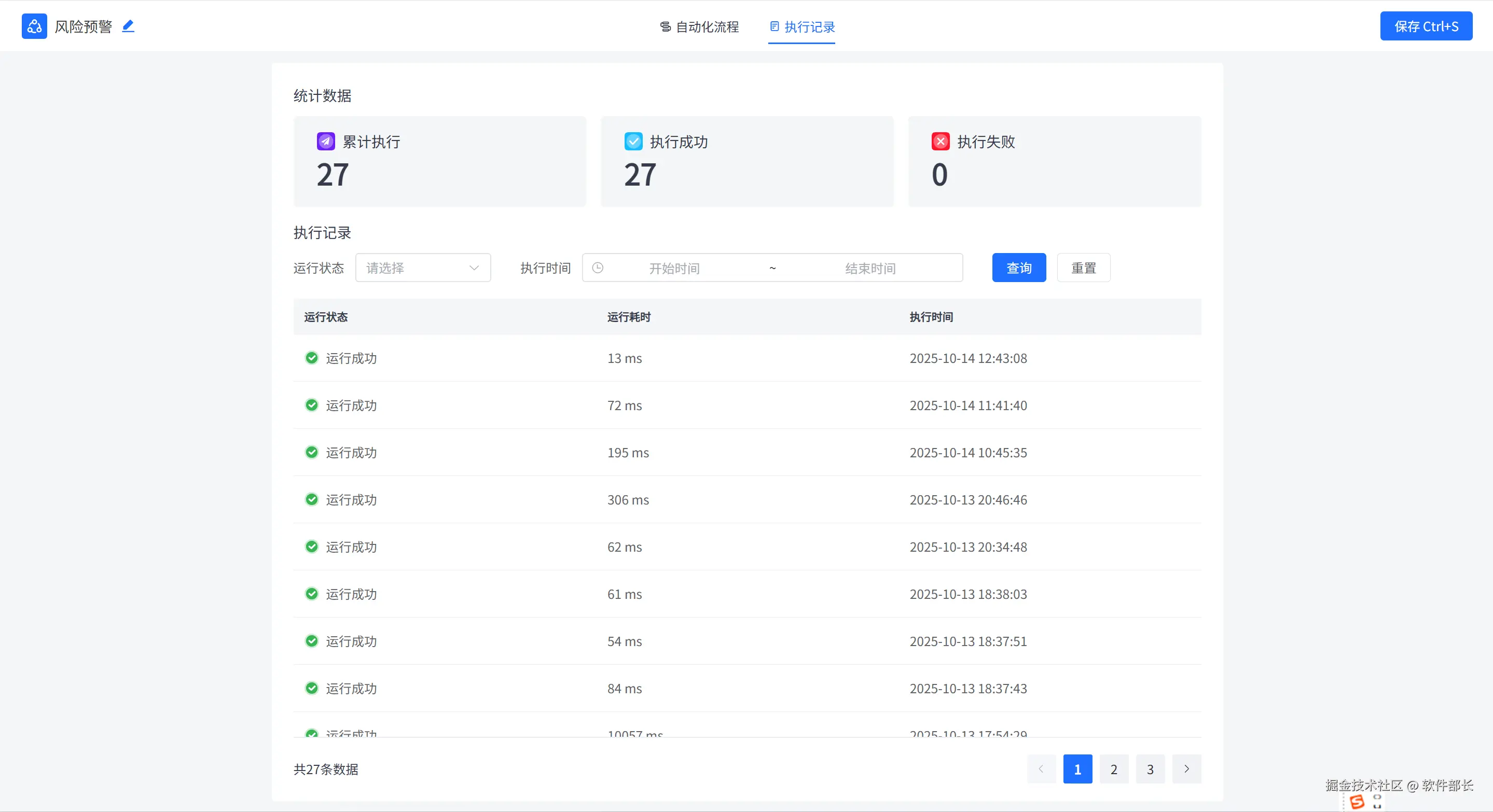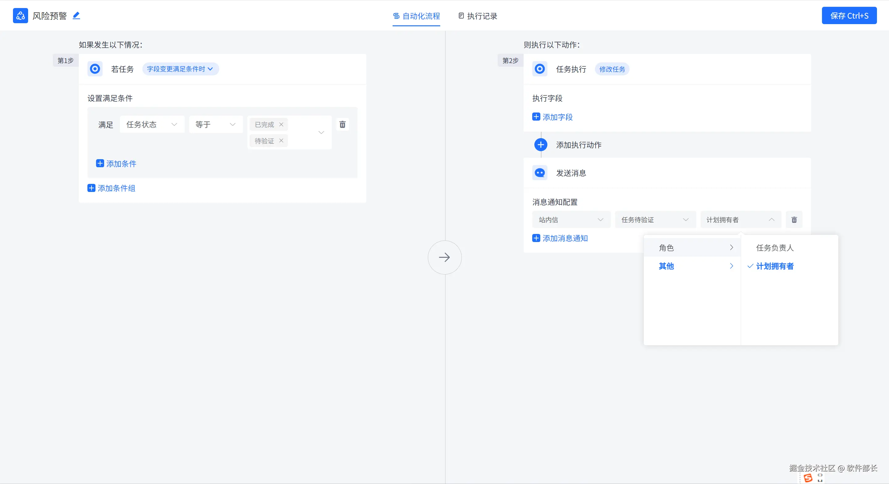 4、优化计划管理中中的自动化流程,自动化流程采用条件触发器的方式进行构建,设置触发的场景,触发的条件,配置执行的功能,本次优化了部分组件的配置操作与执行记录界面: