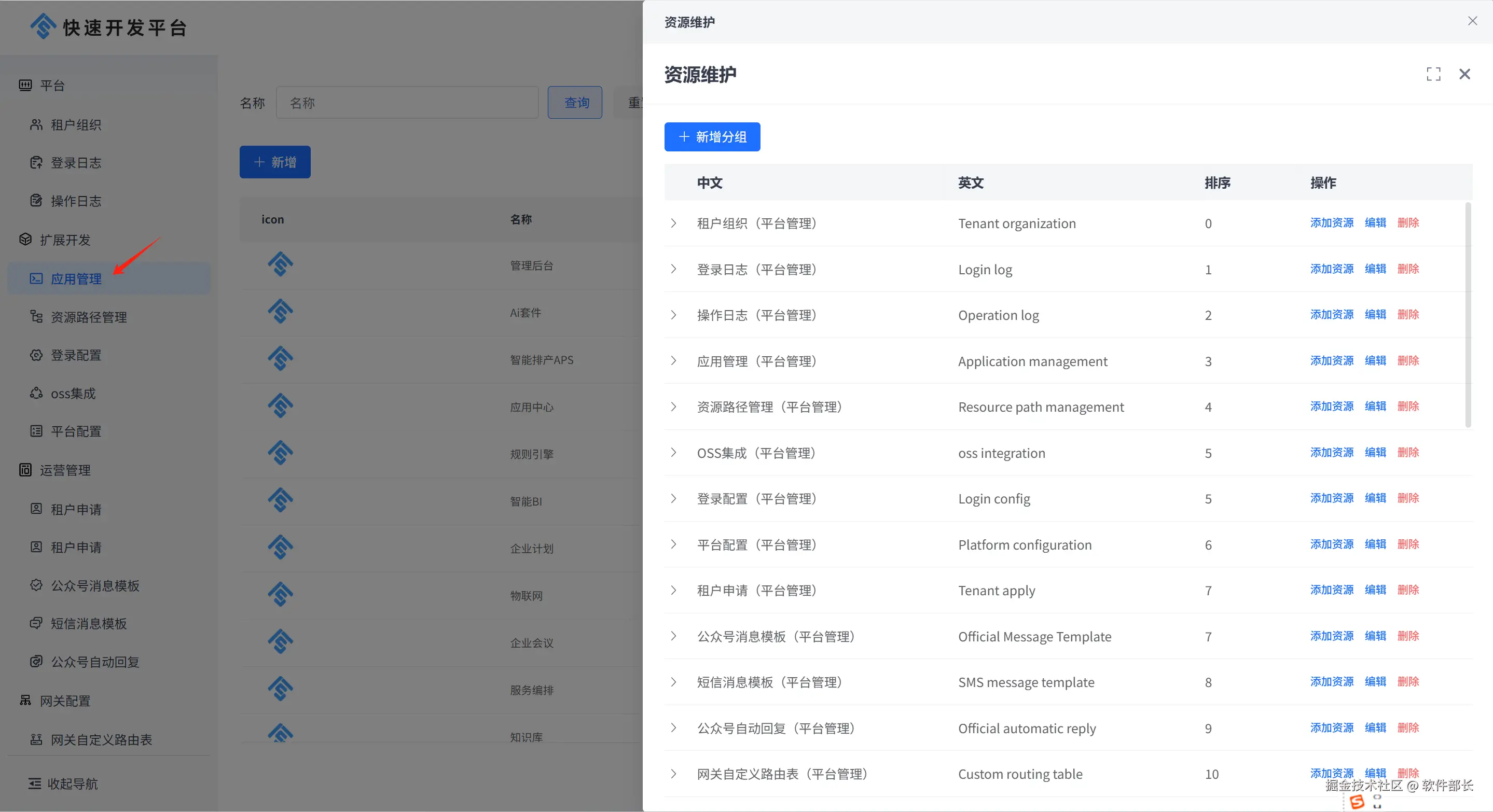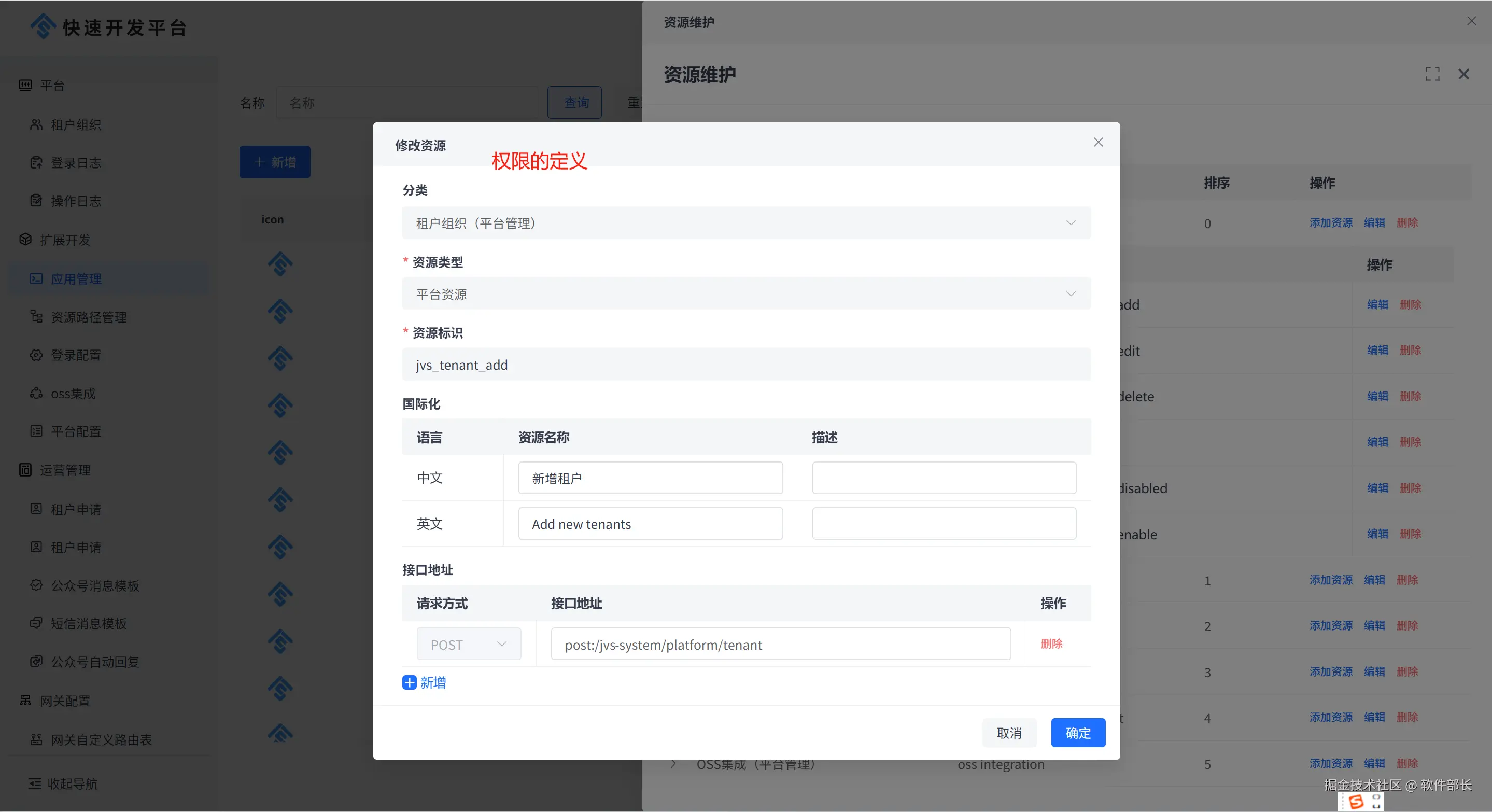 2、基础框架层优化权限的管理方式,提供界面化定义权限(平台级)与使用层引用权限(租户级),在平台层定义应用与应用权限,如下图所示: