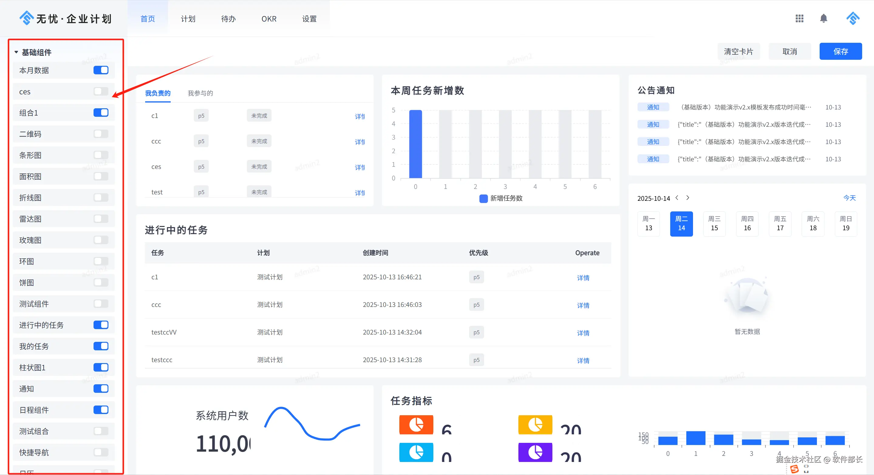 2、增加teamwork 的首页的配置,首页做到千人前面,每个用户根据自己的要求可以设置自己的登录首页,用户只需要开启某些自己需要的组件即可。