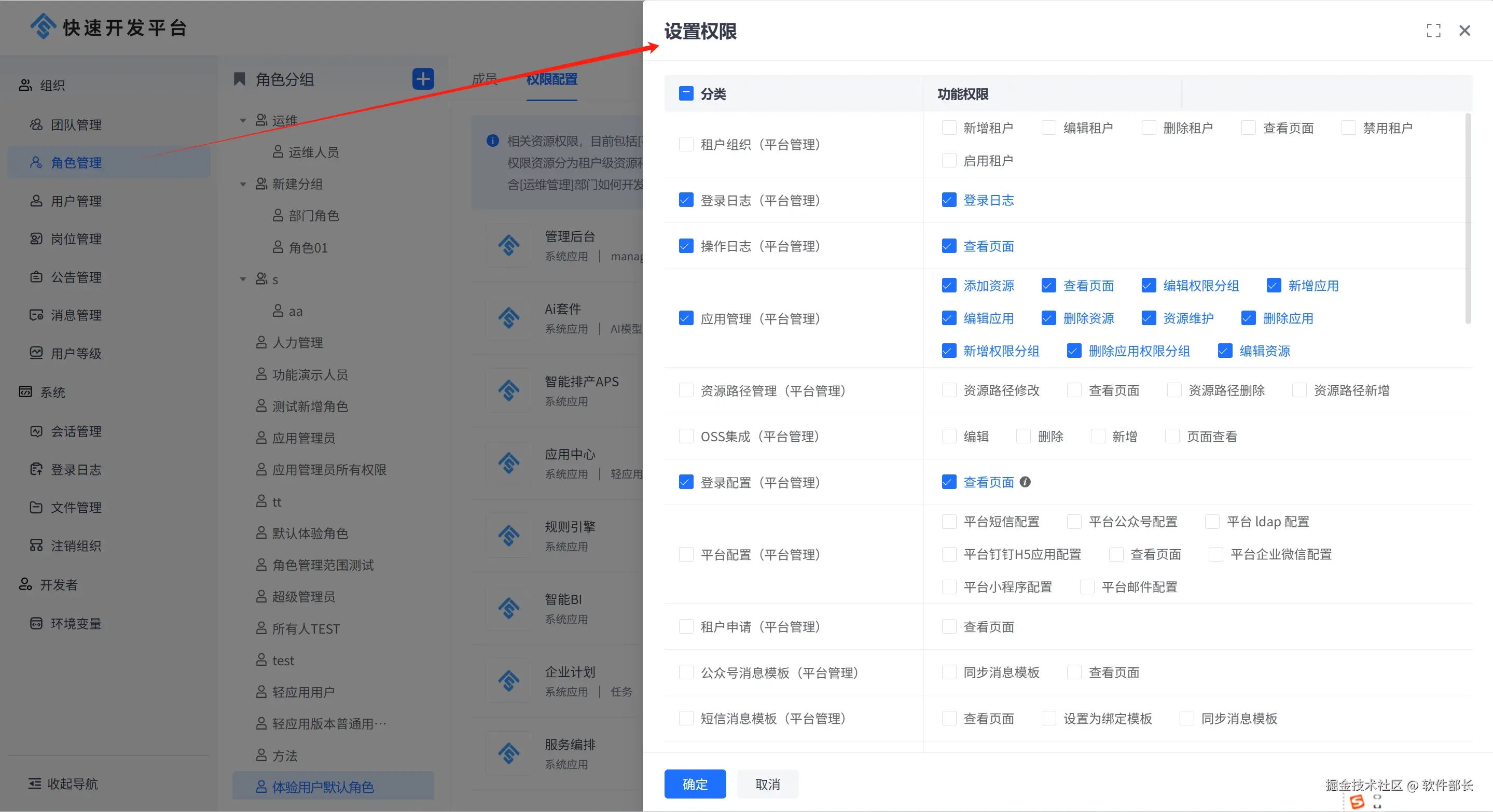 在管理后台层(租户级)可以对该权限进行分配给对应角色