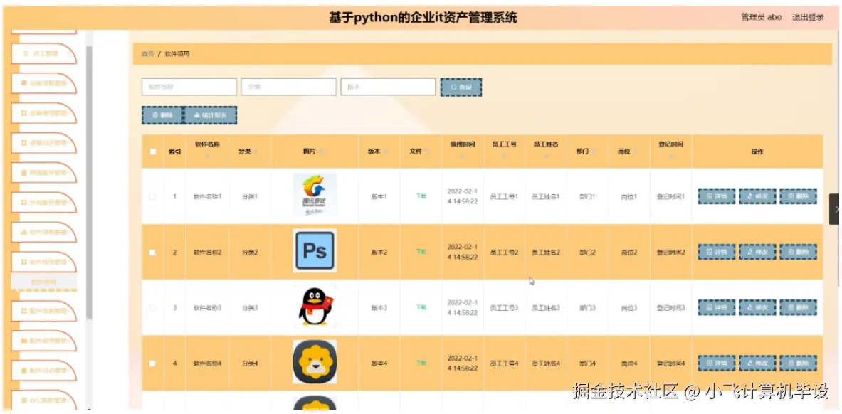| 管理员 | 1. 资产录入:添加设备(如电脑、服务器)、软件(如 Office、Photoshop)、耗材(如硒鼓、U 盘)信息,生成唯一资产编号;2. 审批管理:审批员工的设备借用 / 耗材领用申请,设置借用期限(如笔记本电脑最长借用 1 个月);3. 统计分析:查看资产使用报表(如 “各部门设备占用率”“耗材月度消耗趋势”),辅助采购决策;4. 预警管理:设置软件授权到期、设备保修到期预警,系统自动推送通知 |