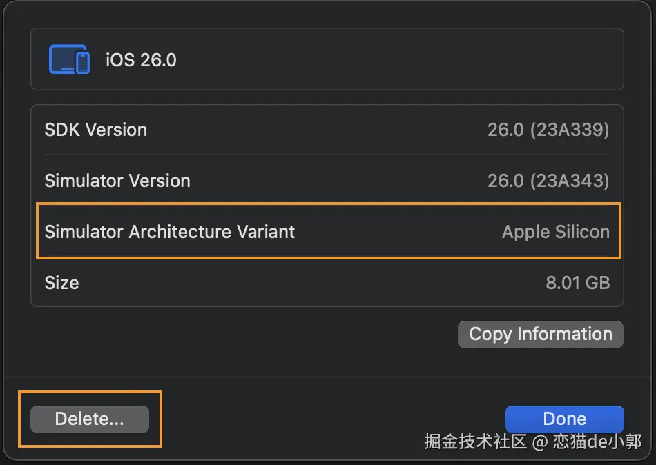 所以,解决方案是强制 Xcode 下载 iOS 26 模拟器的“通用”版本,而不是默认的“Apple Silicon”,所以你首先要通过 Xcode -> Settings -> Components -> iOS 26.0 info symbol 确定你的模拟器架构: