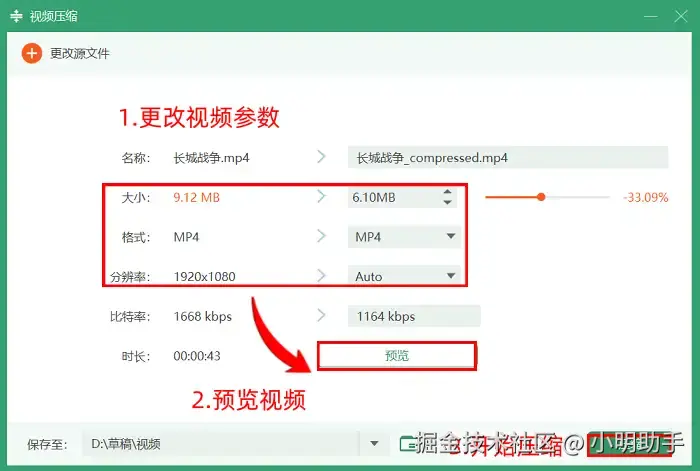 步骤3: 根据自身需求调整视频的大小、分辨率等参数,随后点击【预览】功能查看调整后的视频,合适后即可点击【压缩】按钮,视频压缩就完成了!