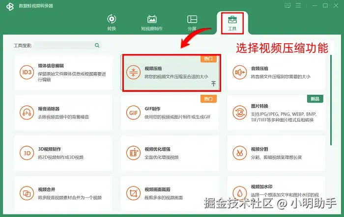 步骤1: 打开软件后,在软件上方,将页面切换至【工具】页面,找到【视频压缩】图标后即可点击进入。