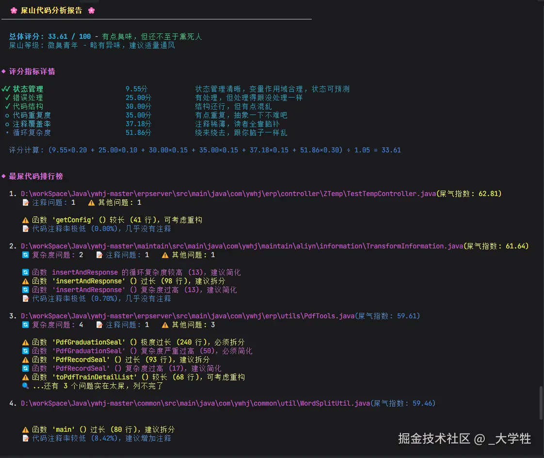 它会从循环复杂度、状态管理、注释覆盖率、代码结构、代码重复度、错误处理和命名规范 七个维度,对你的项目进行全面扫描,计算出一个 屎山指数 ,让你直观地看到——你的代码到底烂到什么程度 💩。