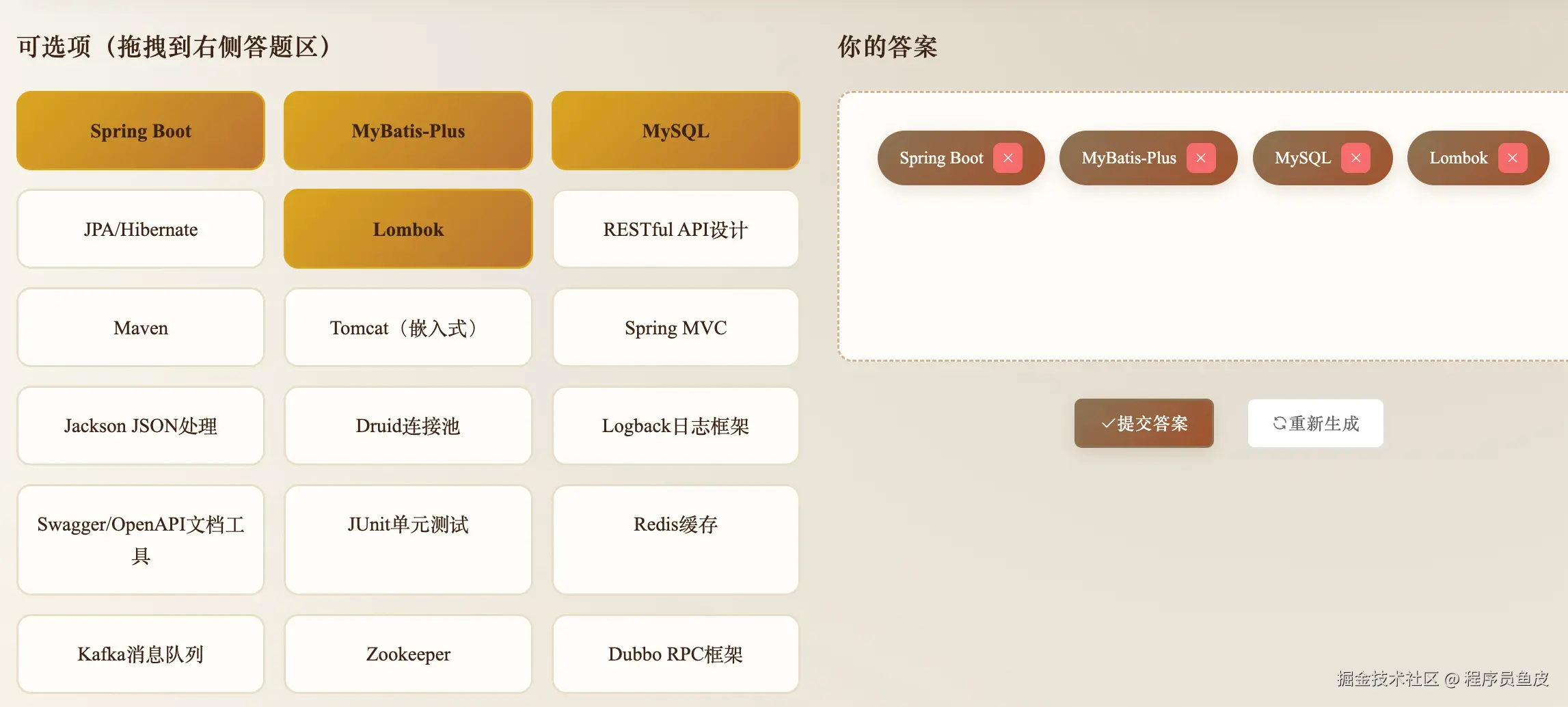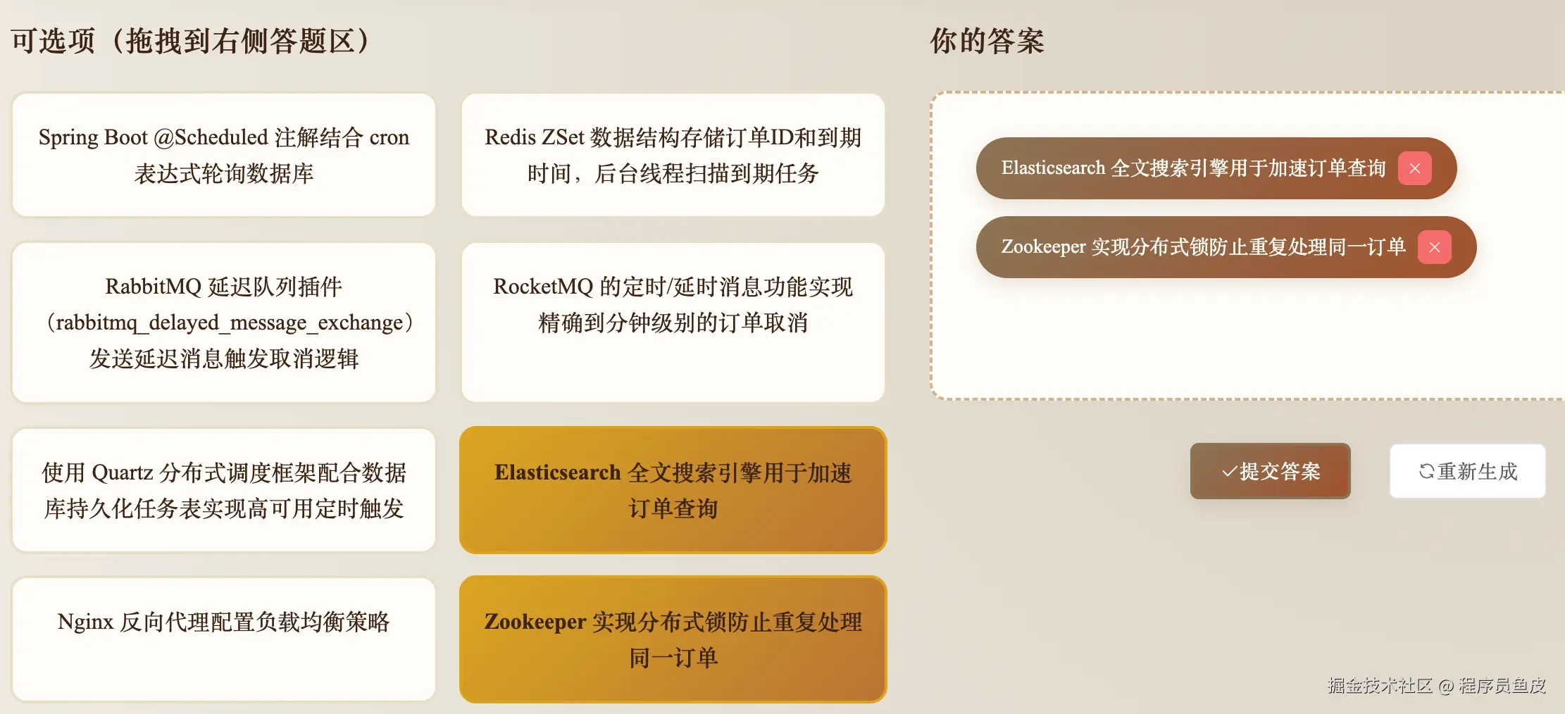 然后来到选项区,挑战规则甚是简单,只要选择能够实现并且适合实现这个需求的技术,拖拽到答案区就可以了。