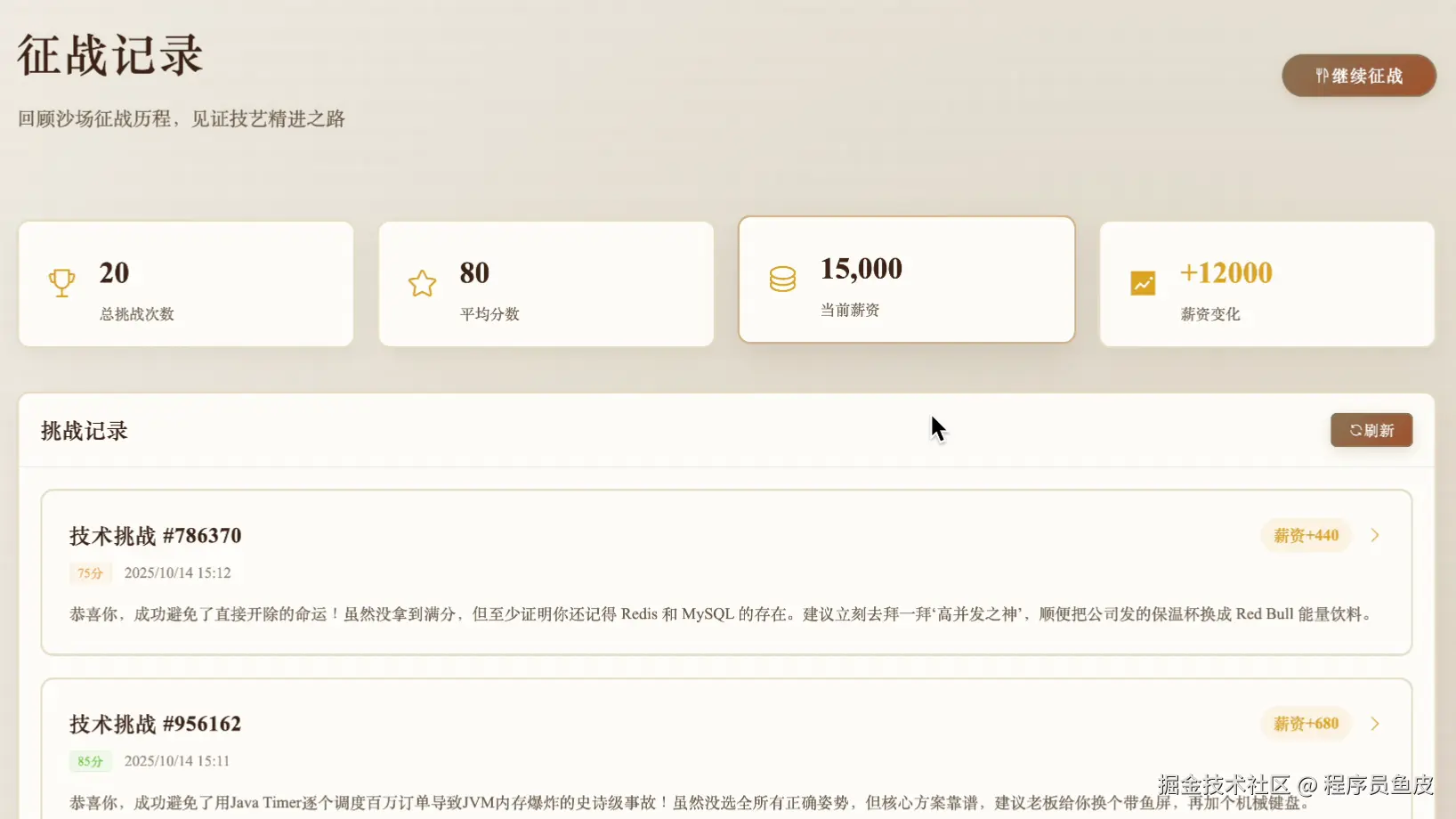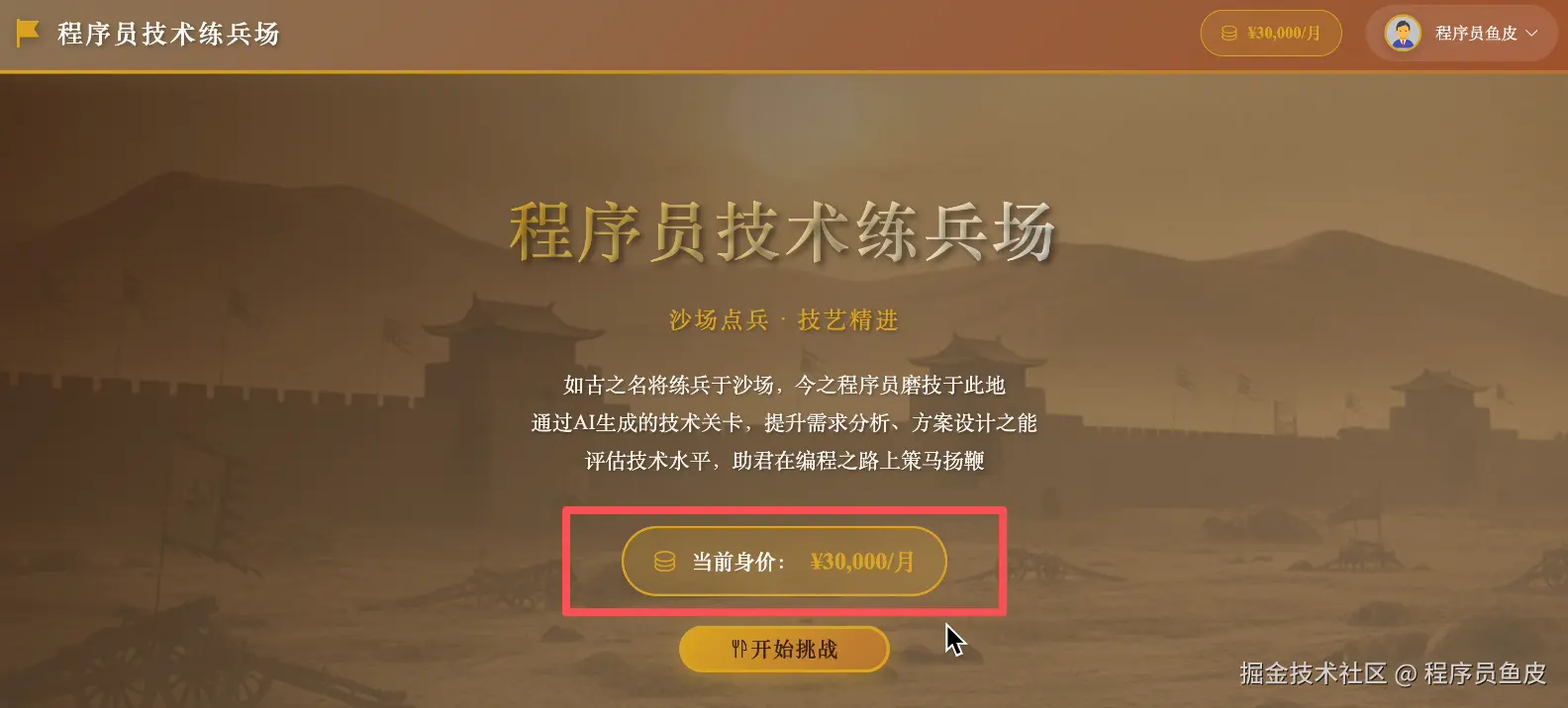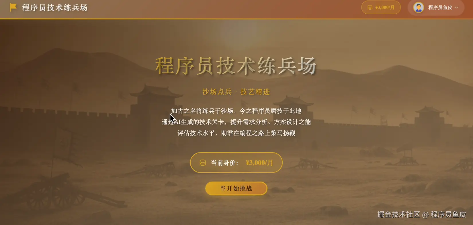 你是一名月薪 3000 的程序员,慕名来到鱼皮的技术练兵场,听闻此地可通过不断挑战提升技术水平和薪资,策马奔腾。