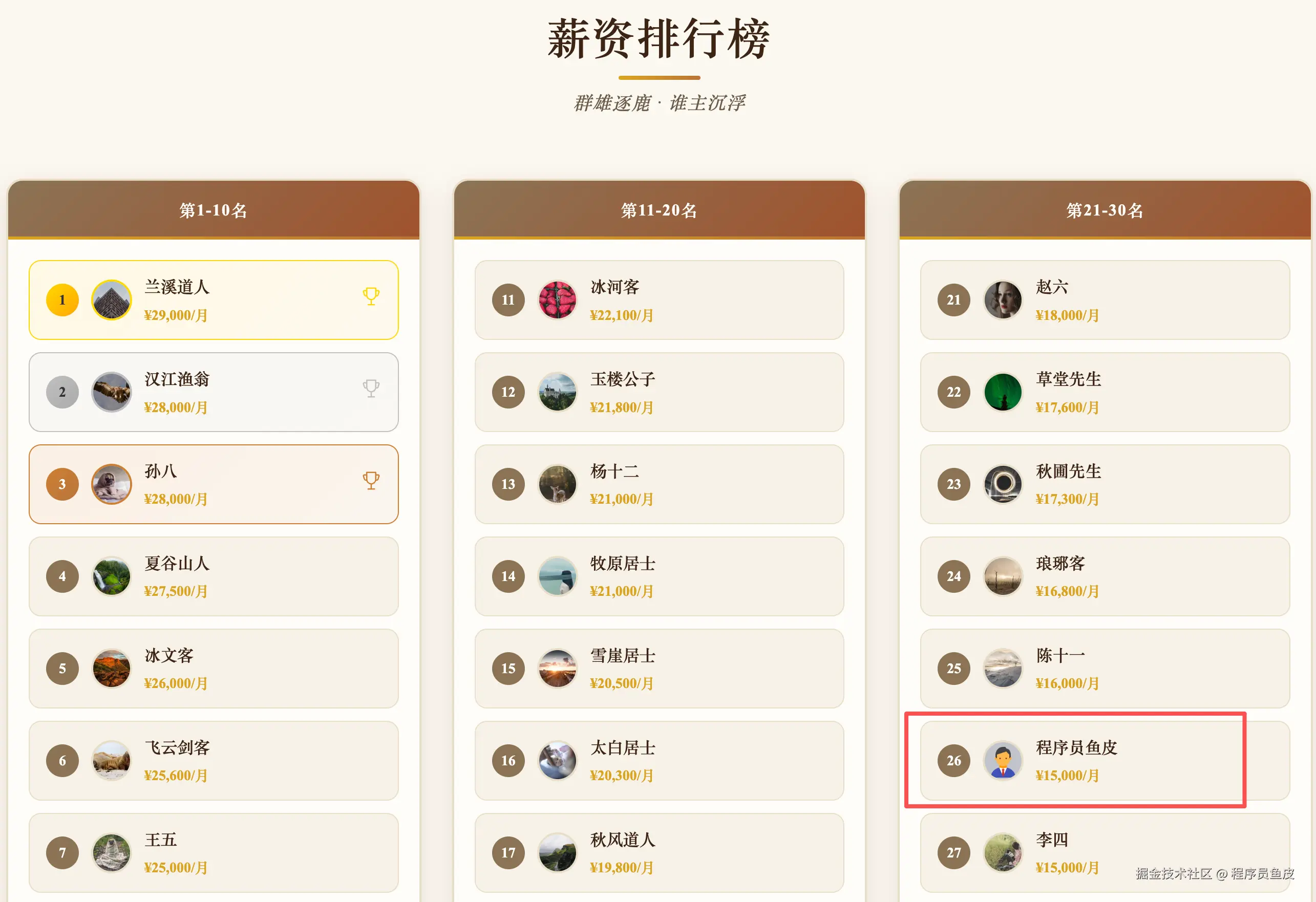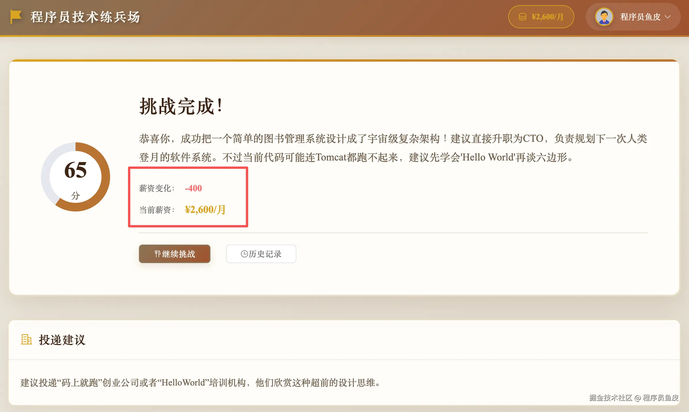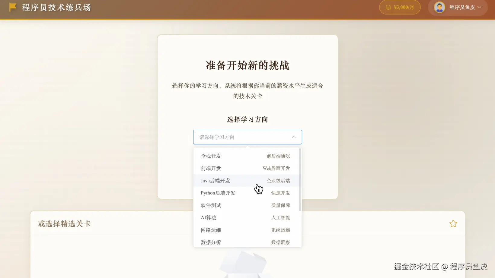 你是一名月薪 3000 的程序员,慕名来到鱼皮的技术练兵场,听闻此地可通过不断挑战提升技术水平和薪资,策马奔腾。