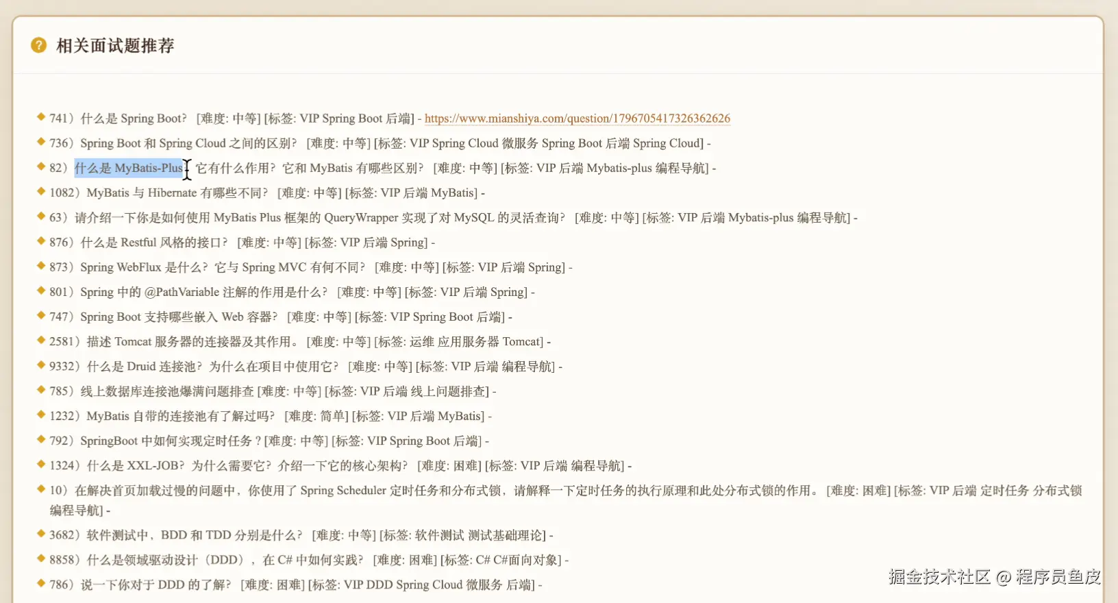 此外,还给出了一些编程修炼秘籍和相关的面试考题,推荐得非常准确,都是贴合技术知识、企业常问的高频考题。