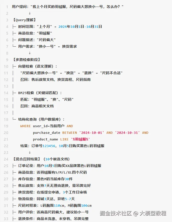 - 用了RAG的智能客服: "您好,查询到您10月5日购买的XX品牌羽绒服(订单号123456),该商品支持7天无理由退换。由于您购买的黑色L码库存充足,可以直接为您换成M码,预计3天内送达。是否需要我帮您提交换货申请?"