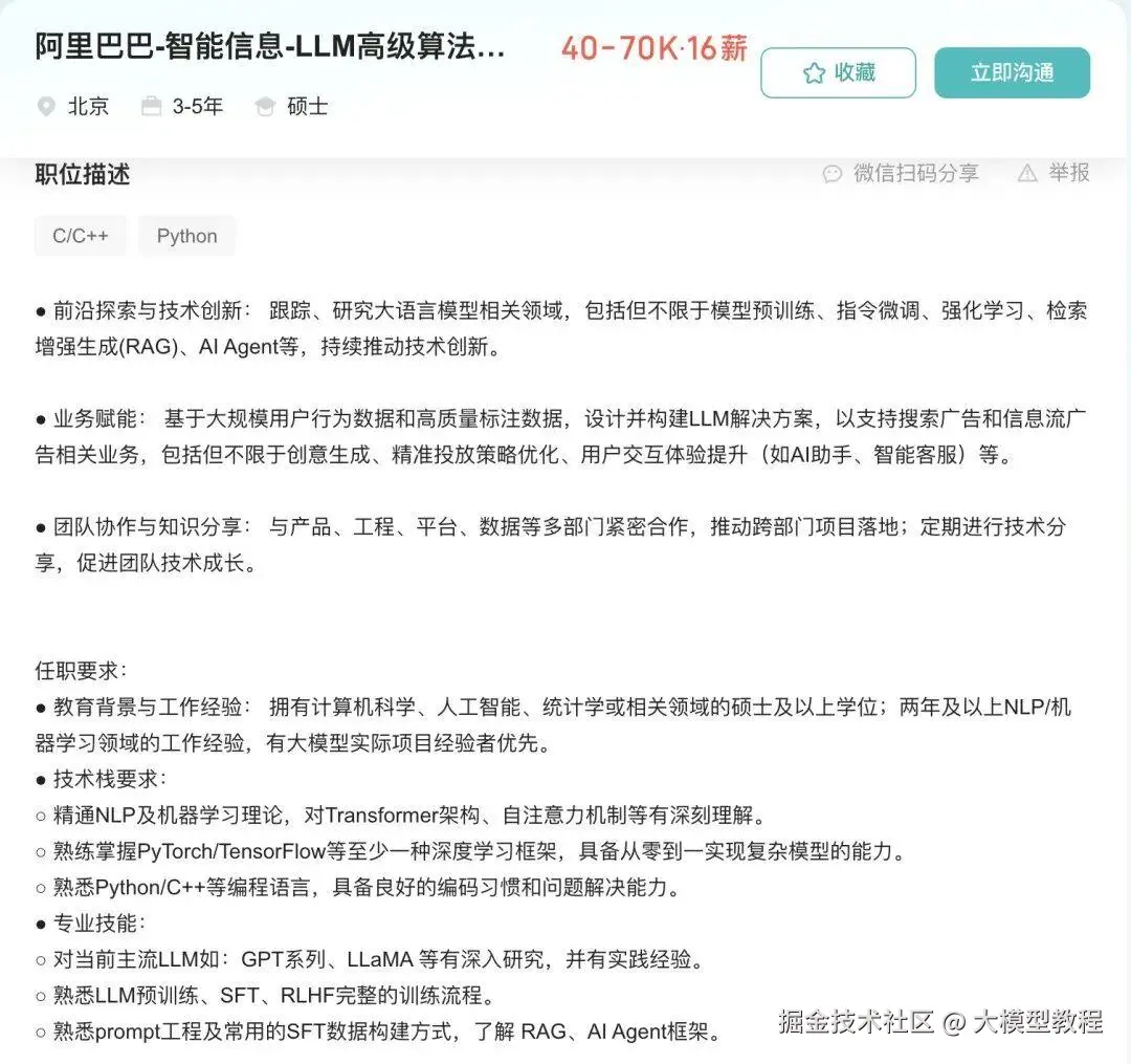 今天拆解的是阿里巴巴智能信息事业部的LLM算法岗,薪资给到了40-70K·16薪(年薪最高112万),JD中的技术要求如下: